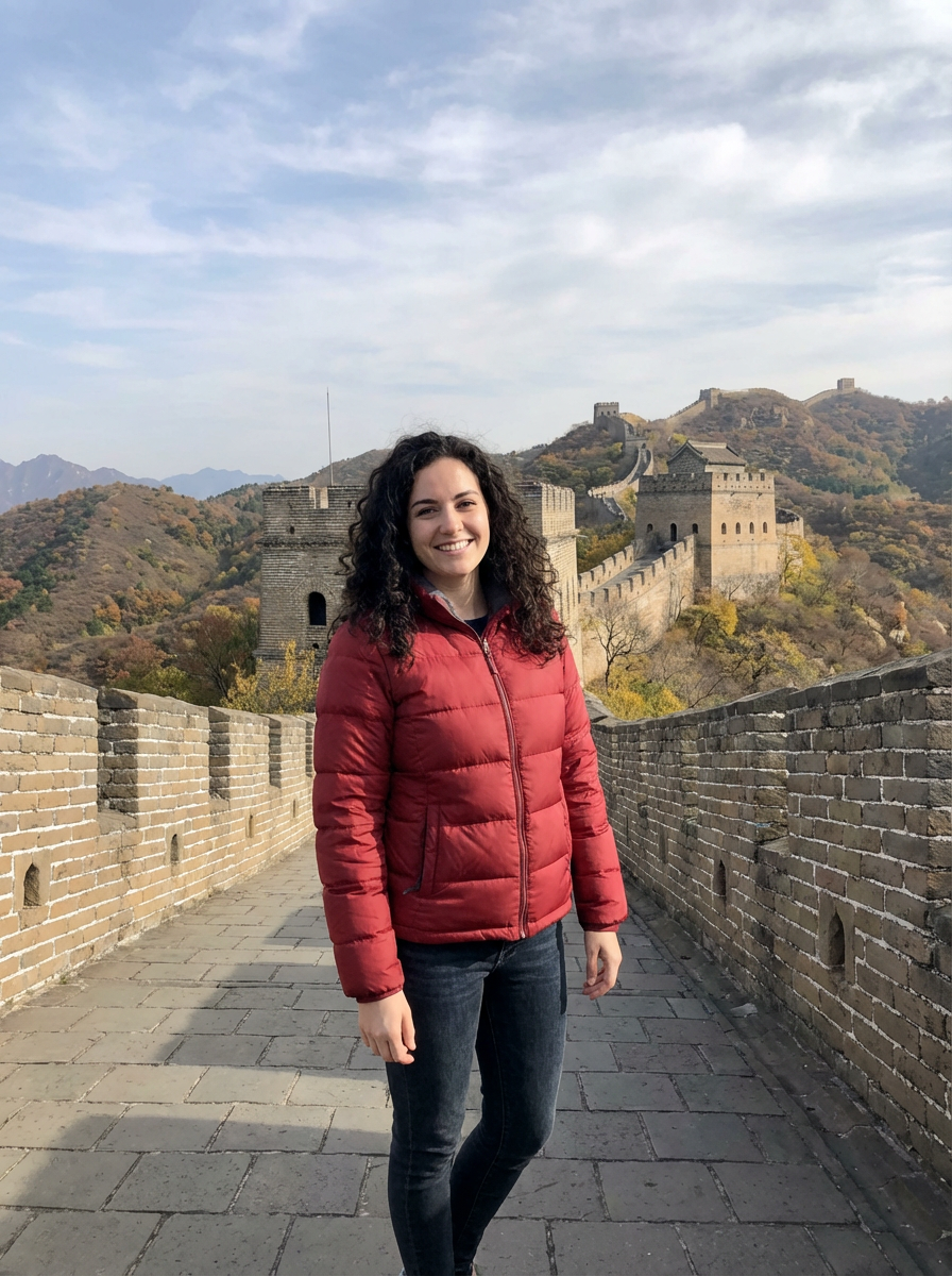 model in Beijing with the Great Wall in the background