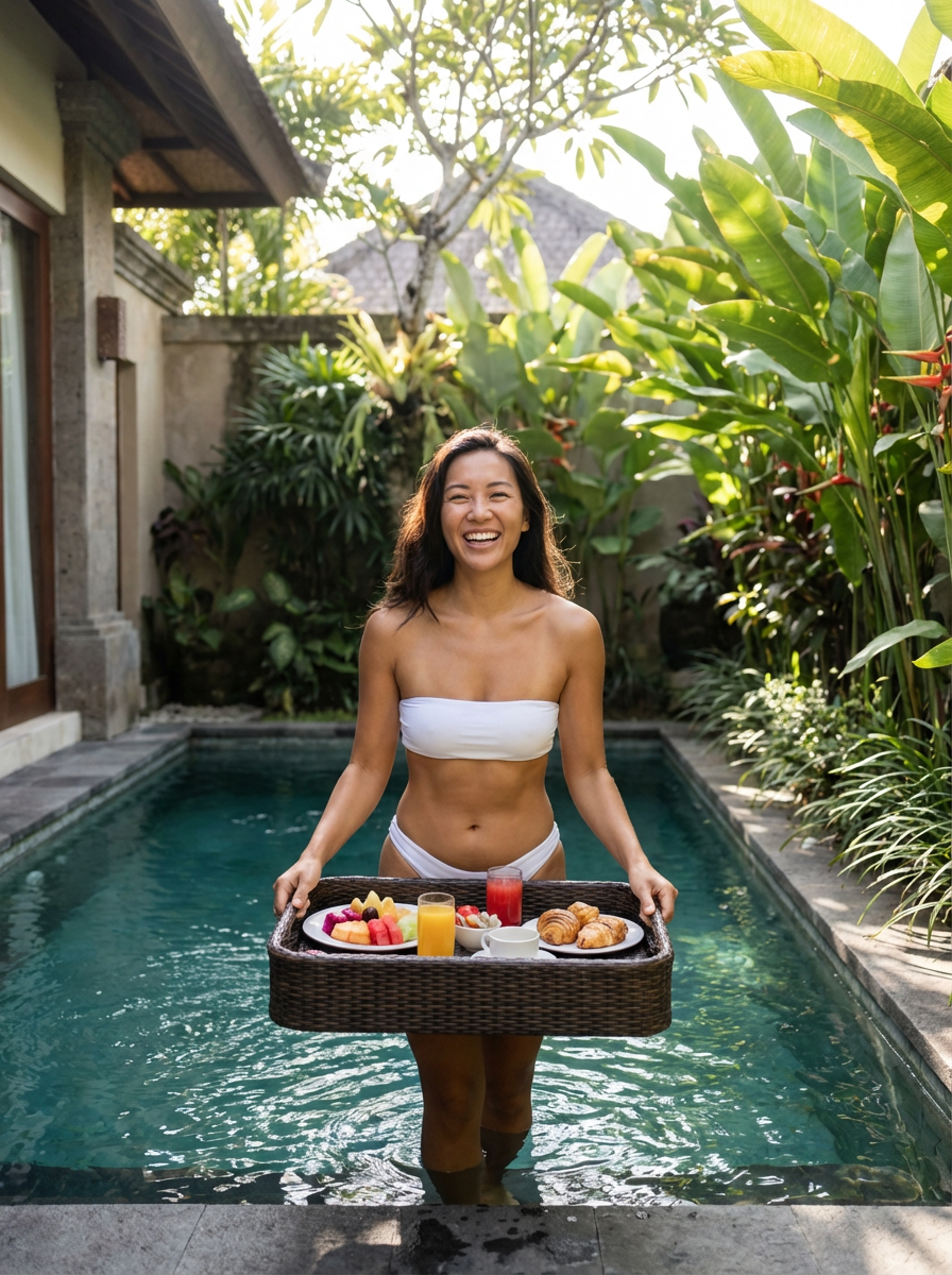model in bikini in modern Canggu villa with floating breakfast in private pool, surrounded by tropical gardens