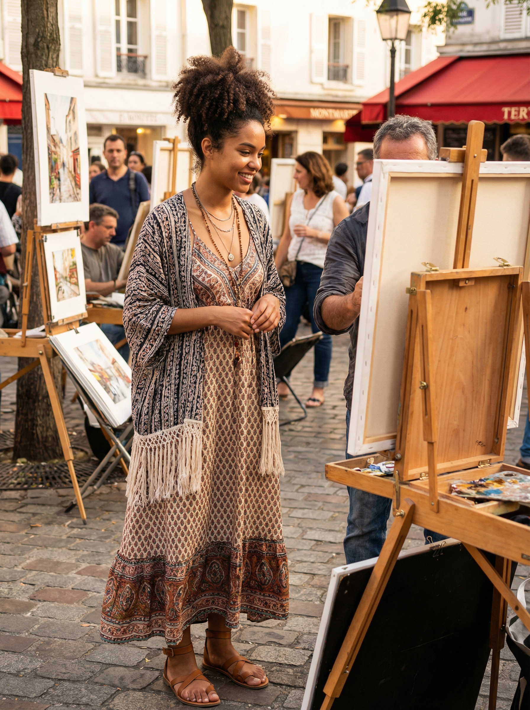 model in bohemian maxi dress, kimono cardigan, flat sandals, layered necklaces at Montmartre artists square watching street painters, artistic bohemian atmosphere, easels and artwork around, creative energy, warm artistic lighting