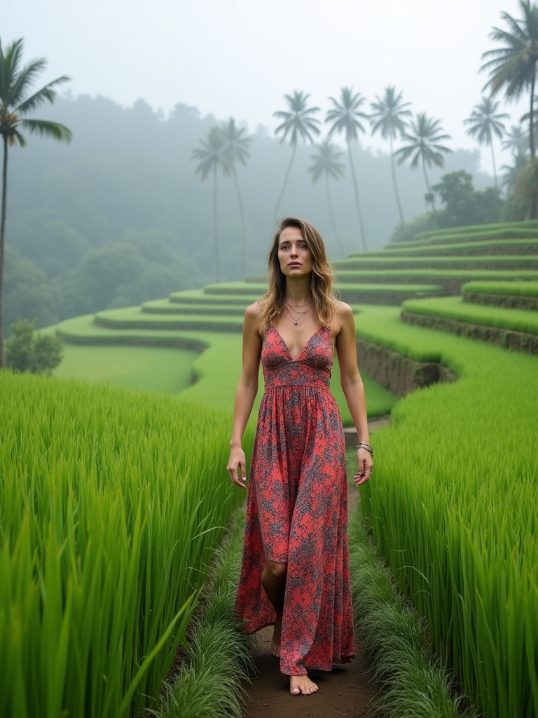 model in bohemian maxi dress walking through terraced rice fields in Tegalalang, morning mist and palm trees in background