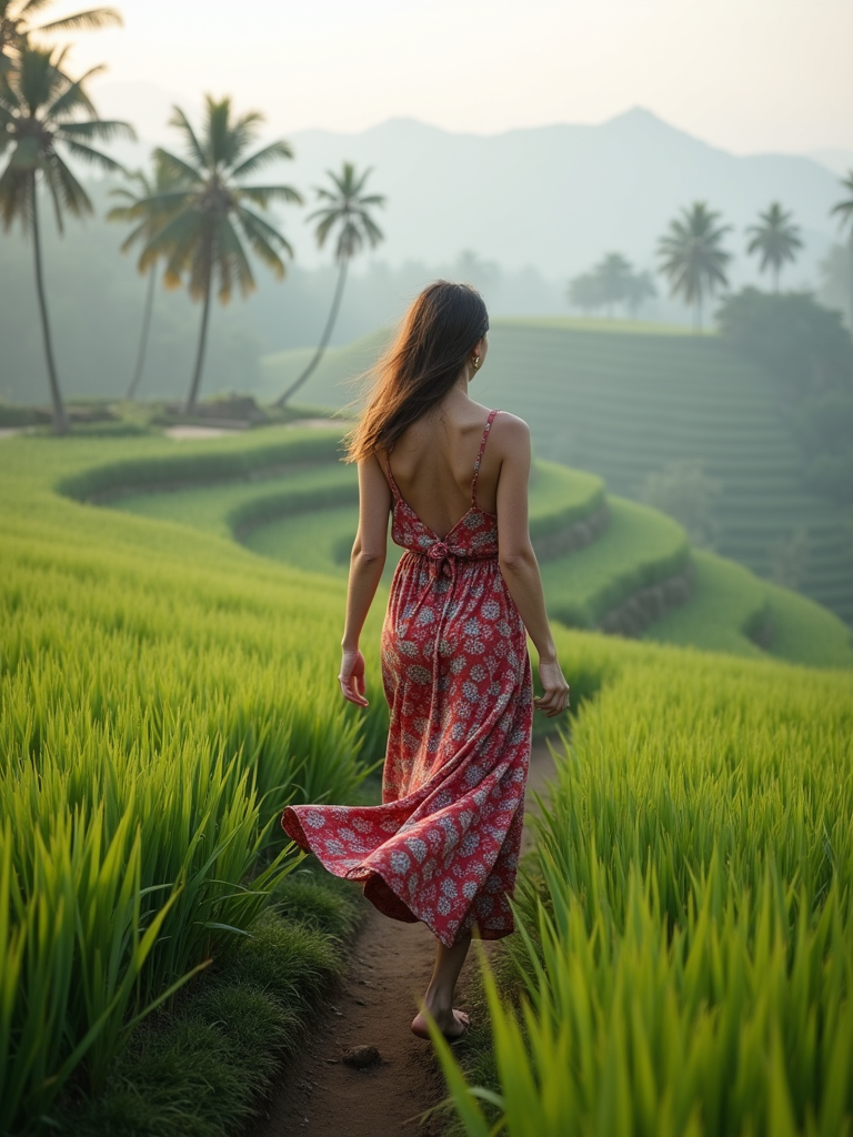 model in bohemian maxi dress walking through terraced rice fields in Tegalalang, morning mist and palm trees in background