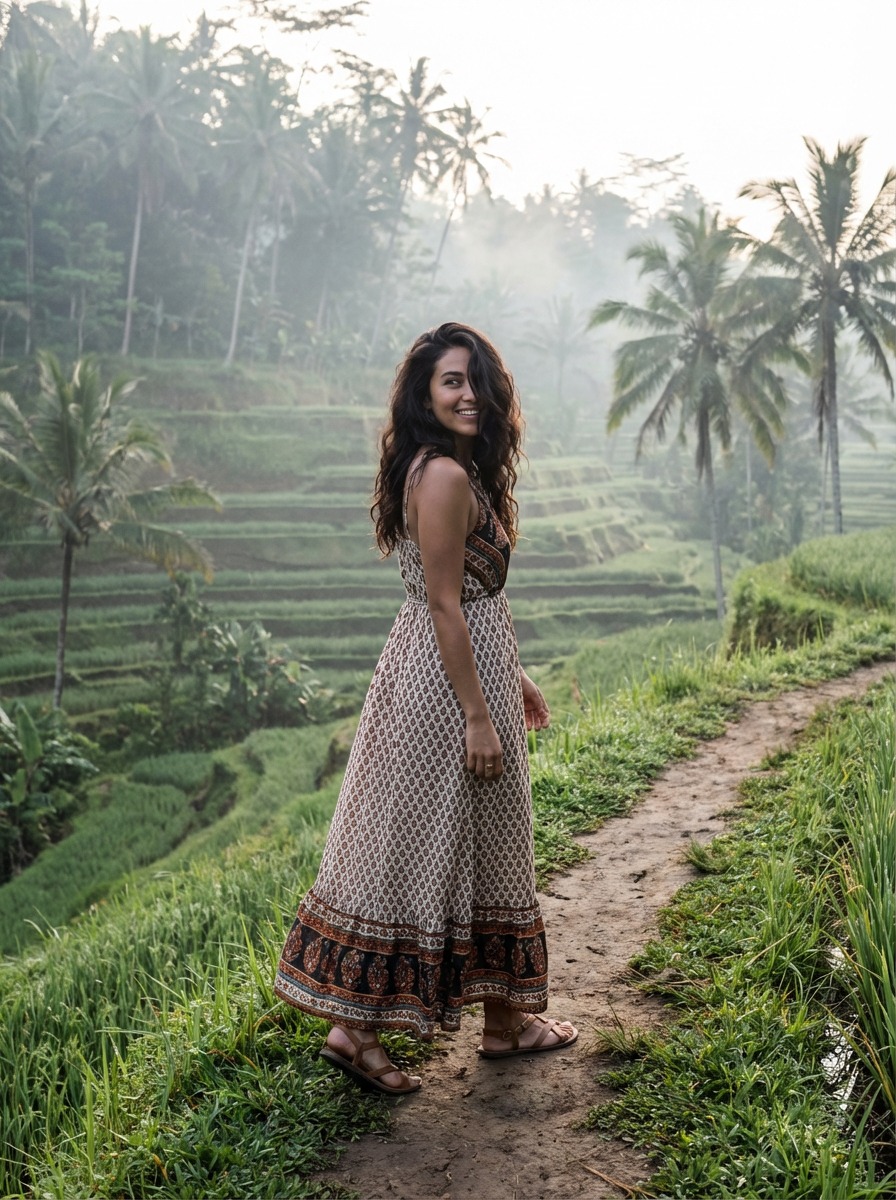model in bohemian maxi dress walking through terraced rice fields in Tegalalang, morning mist and palm trees in background
