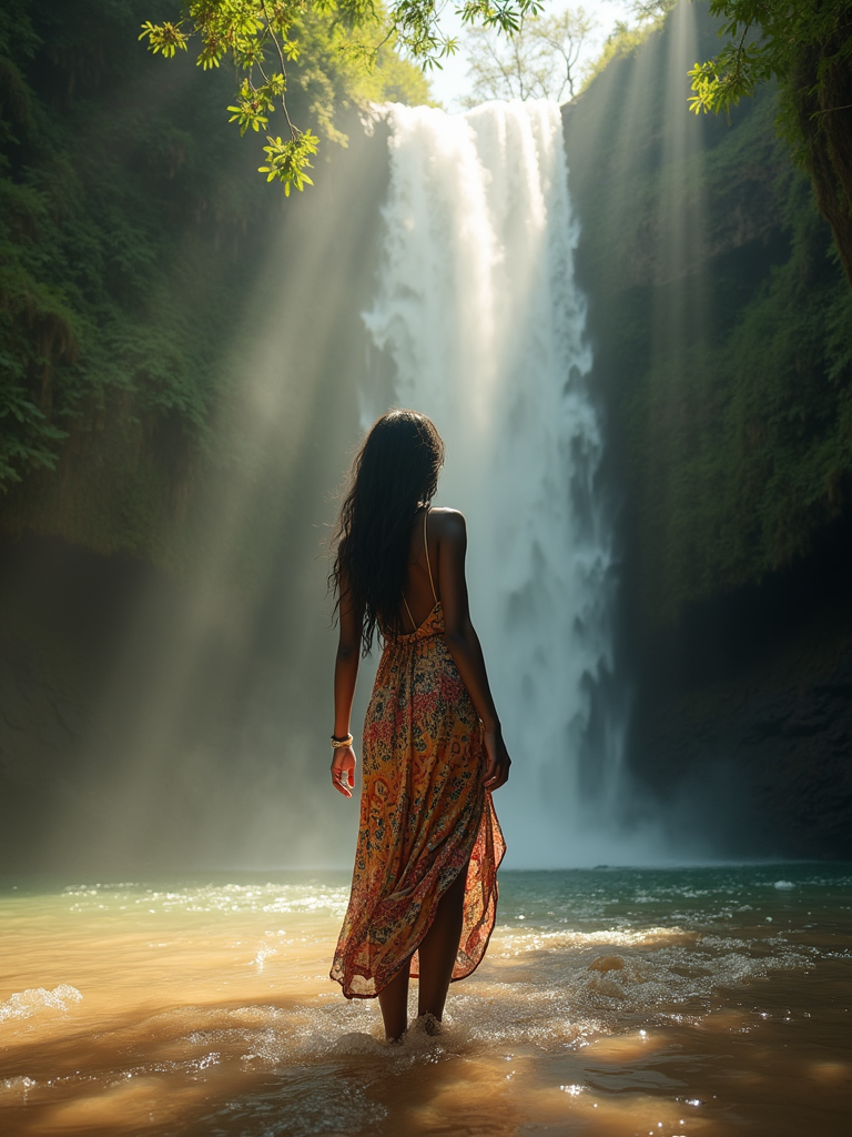 model in boho beach dress exploring hidden waterfall in jungle, rays of light streaming down