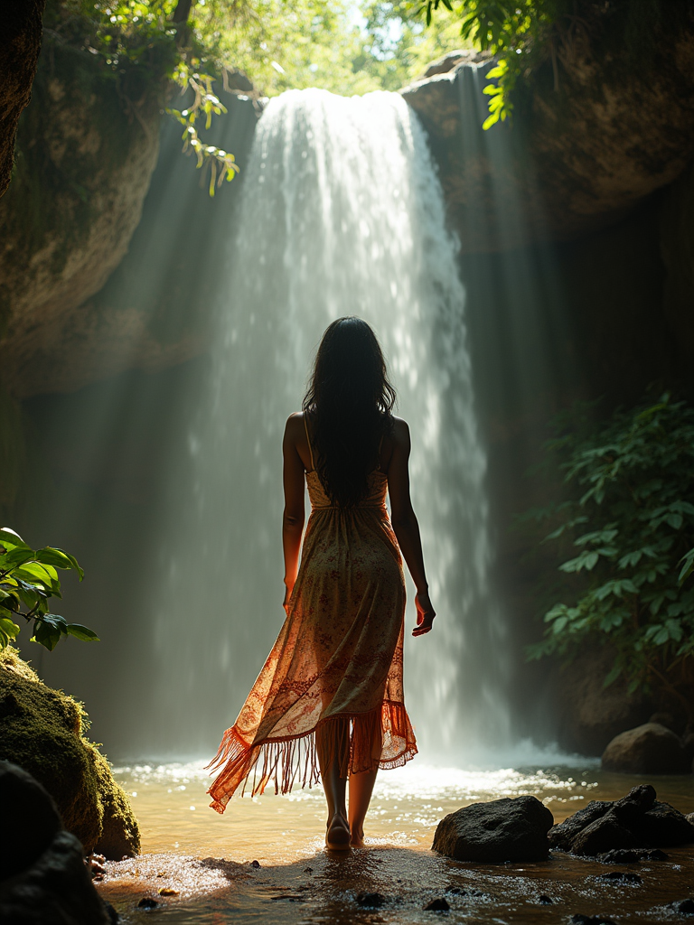 model in boho beach dress exploring hidden waterfall in jungle, rays of light streaming down