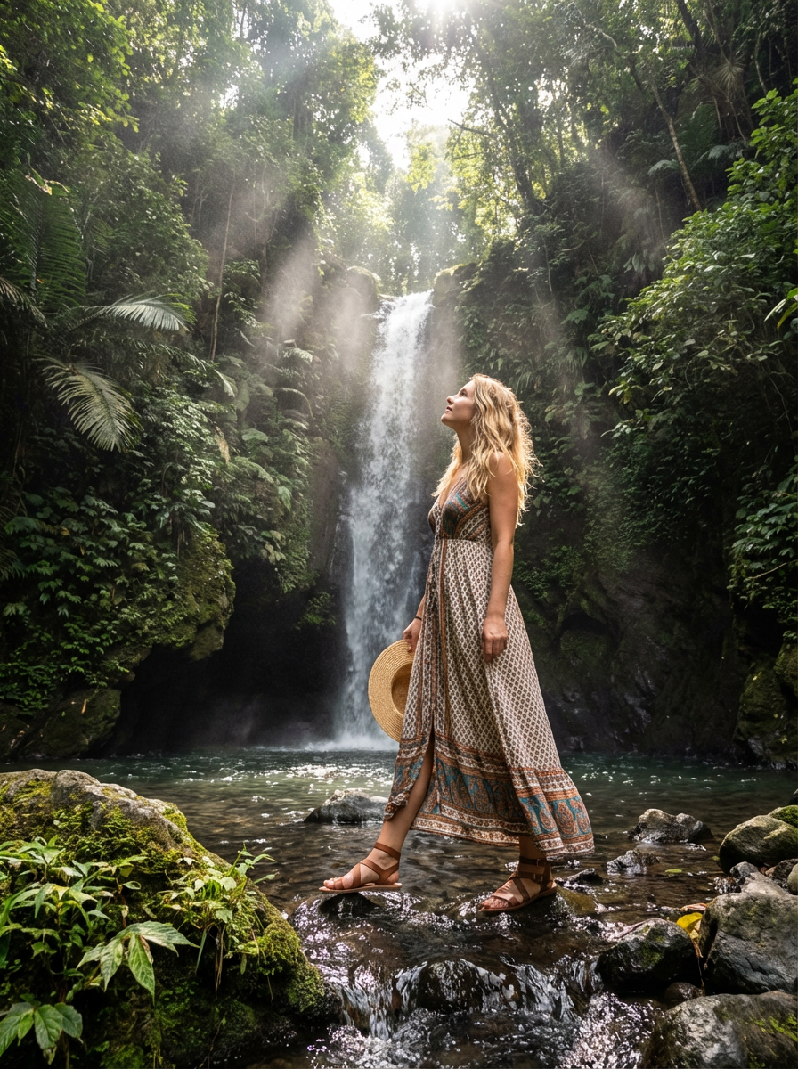 model in boho beach dress exploring hidden waterfall in jungle, rays of light streaming down