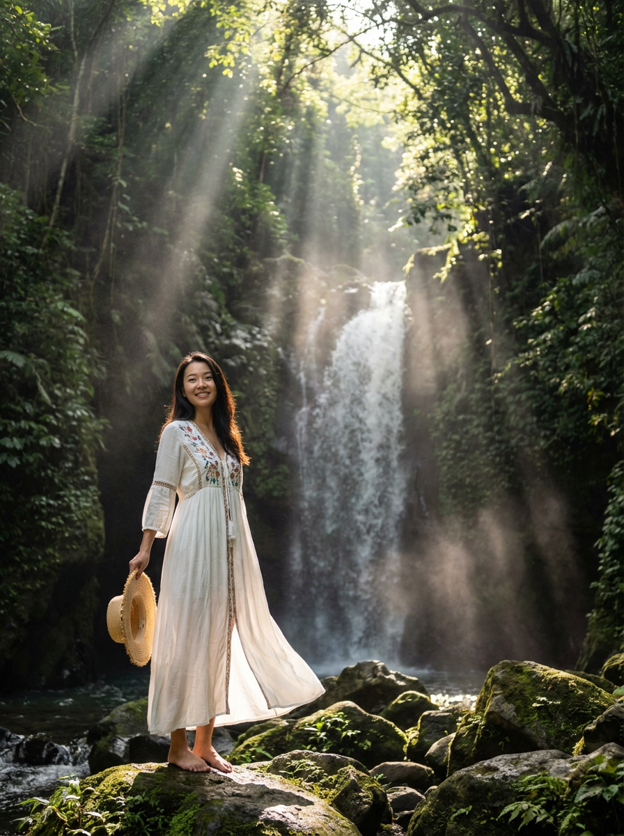 model in boho beach dress exploring hidden waterfall in jungle, rays of light streaming down