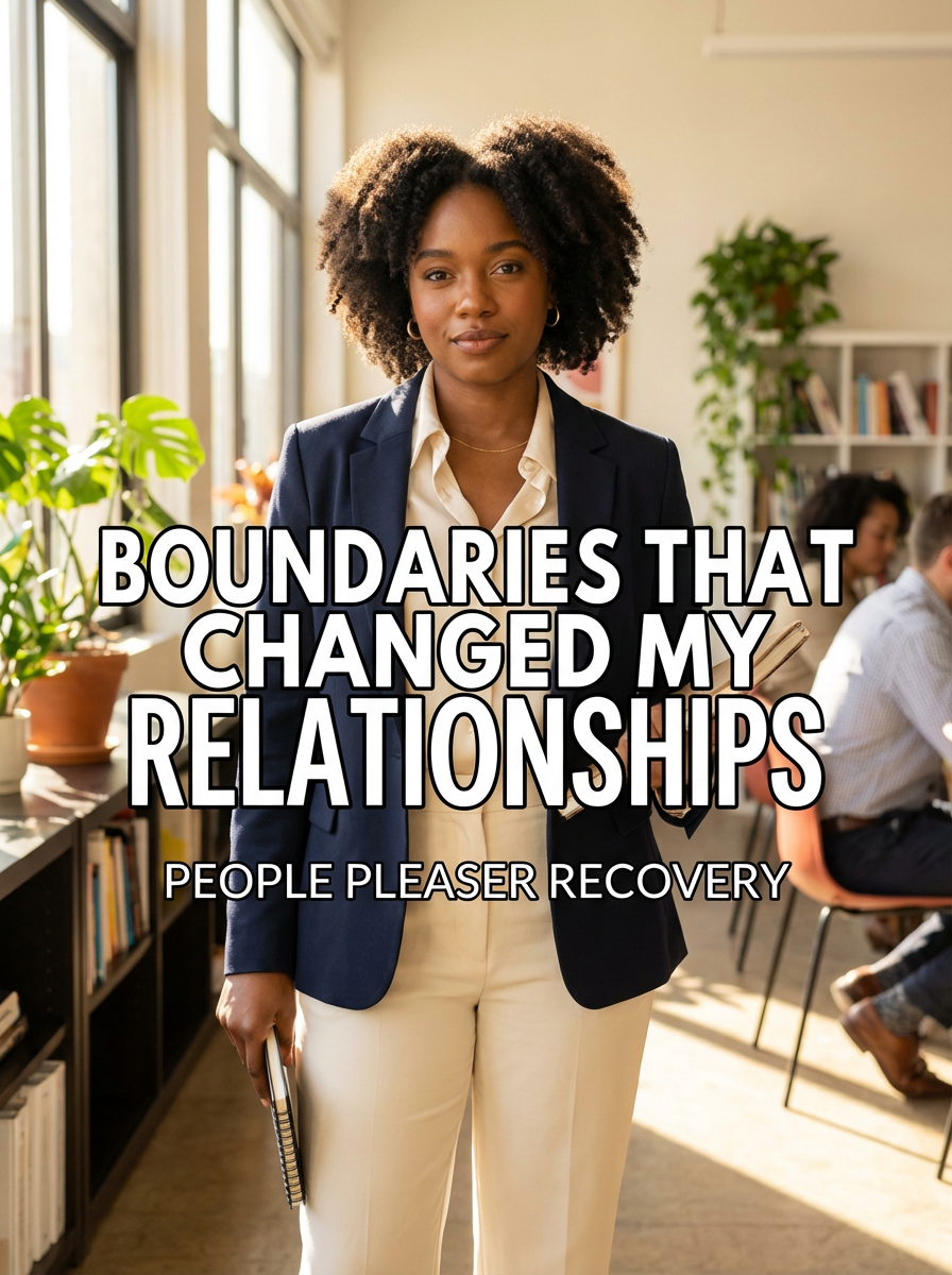 model in boundary setting outfit in professional or personal setting, confident posture, empowering lighting. TikTok-style text overlay with white text with black outline: "boundaries that changed my relationships" smaller text: "(people pleaser recovery)" , do not show tiktok interface or logo