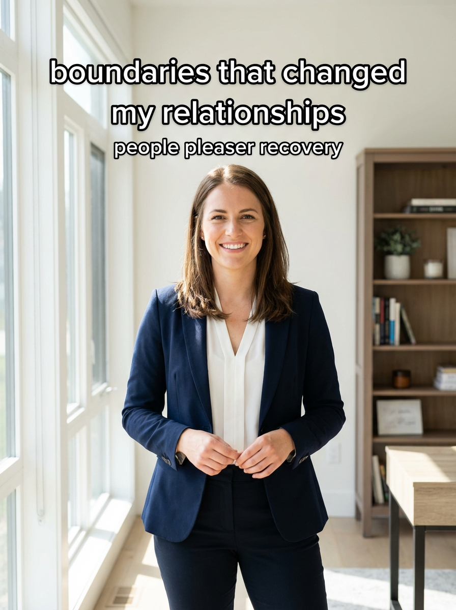 model in boundary setting outfit in professional or personal setting, confident posture, empowering lighting. TikTok-style text overlay with white text with black outline: "boundaries that changed my relationships" smaller text: "(people pleaser recovery)" , do not show tiktok interface or logo