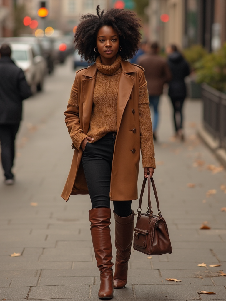 model in brown leather boots, tan sweater, and chocolate accessories , layered earth tones, sophisticated autumn style