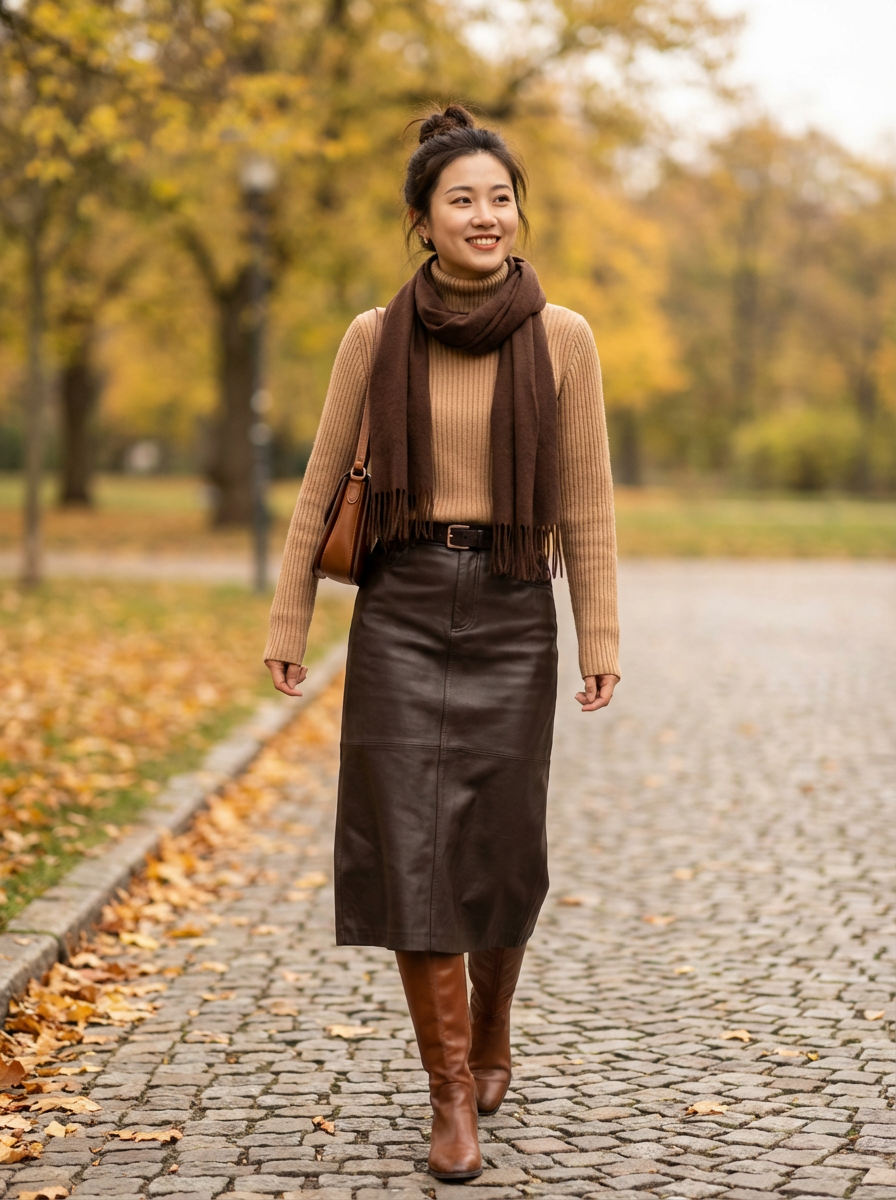 model in brown leather boots, tan sweater, and chocolate accessories , layered earth tones, sophisticated autumn style