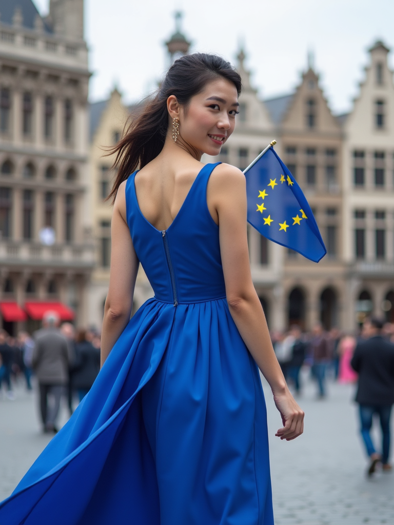 model in Brussels at the Grand Place, wearing a flowing blue dress with gold star accessories , holding a small European flag, the ornate historic buildings creating a picturesque European backdrop