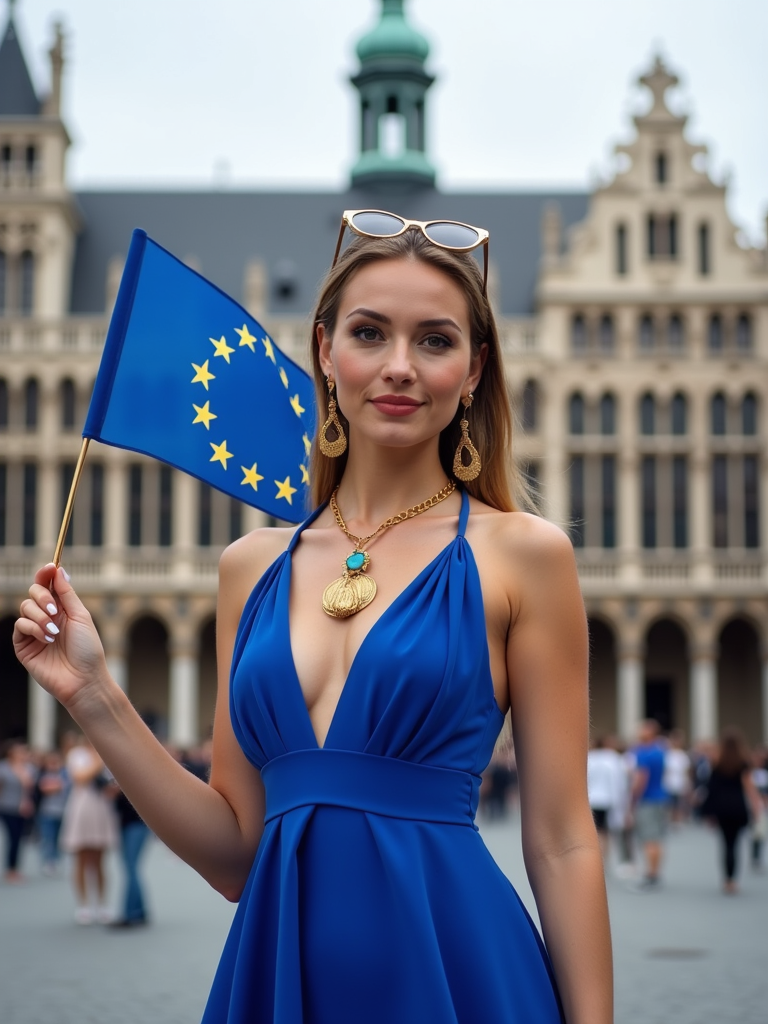 model in Brussels at the Grand Place, wearing a flowing blue dress with gold star accessories , holding a small European flag, the ornate historic buildings creating a picturesque European backdrop