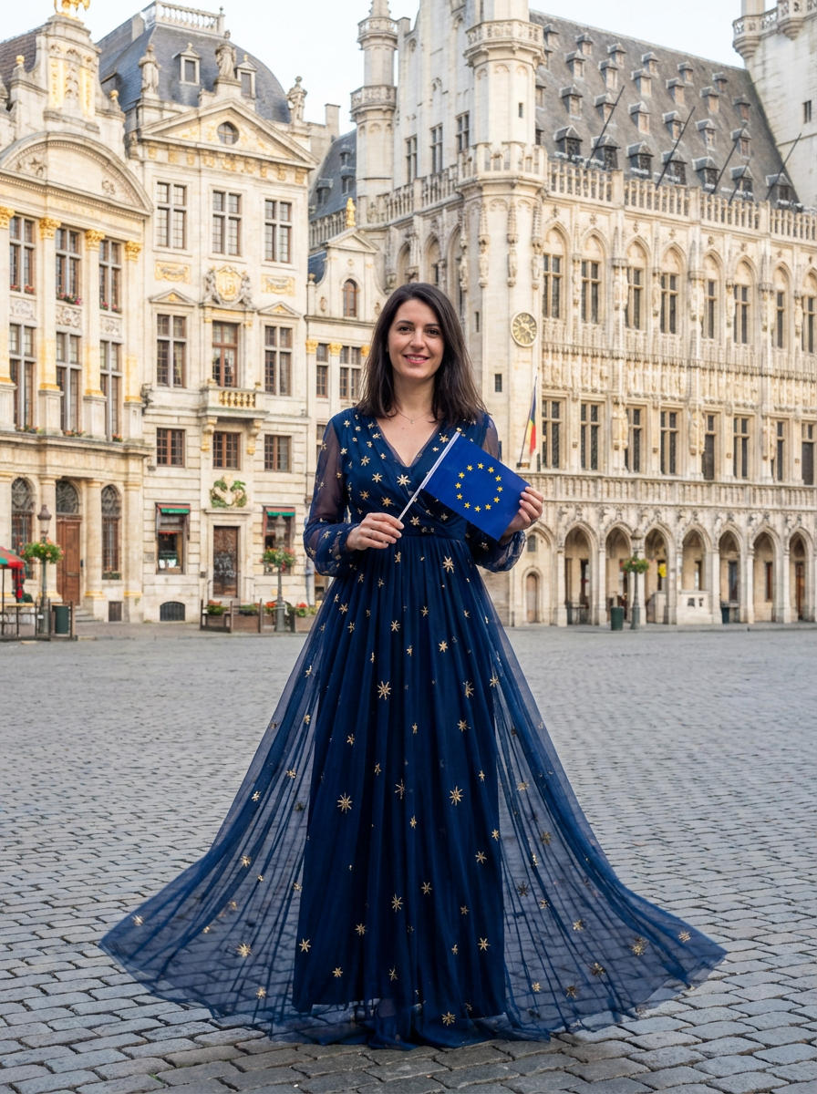 model in Brussels at the Grand Place, wearing a flowing blue dress with gold star accessories , holding a small European flag, the ornate historic buildings creating a picturesque European backdrop