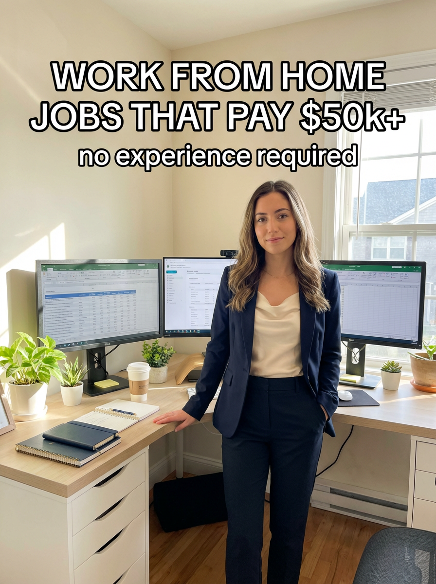 model in business casual outfit at home office setup, multiple monitors, plants, organized desk, natural lighting. TikTok TikTok-style text overlay with white text with black outline: "work from home jobs that pay $50k+" smaller text: "(no experience required)" , do not show tiktok interface or logo