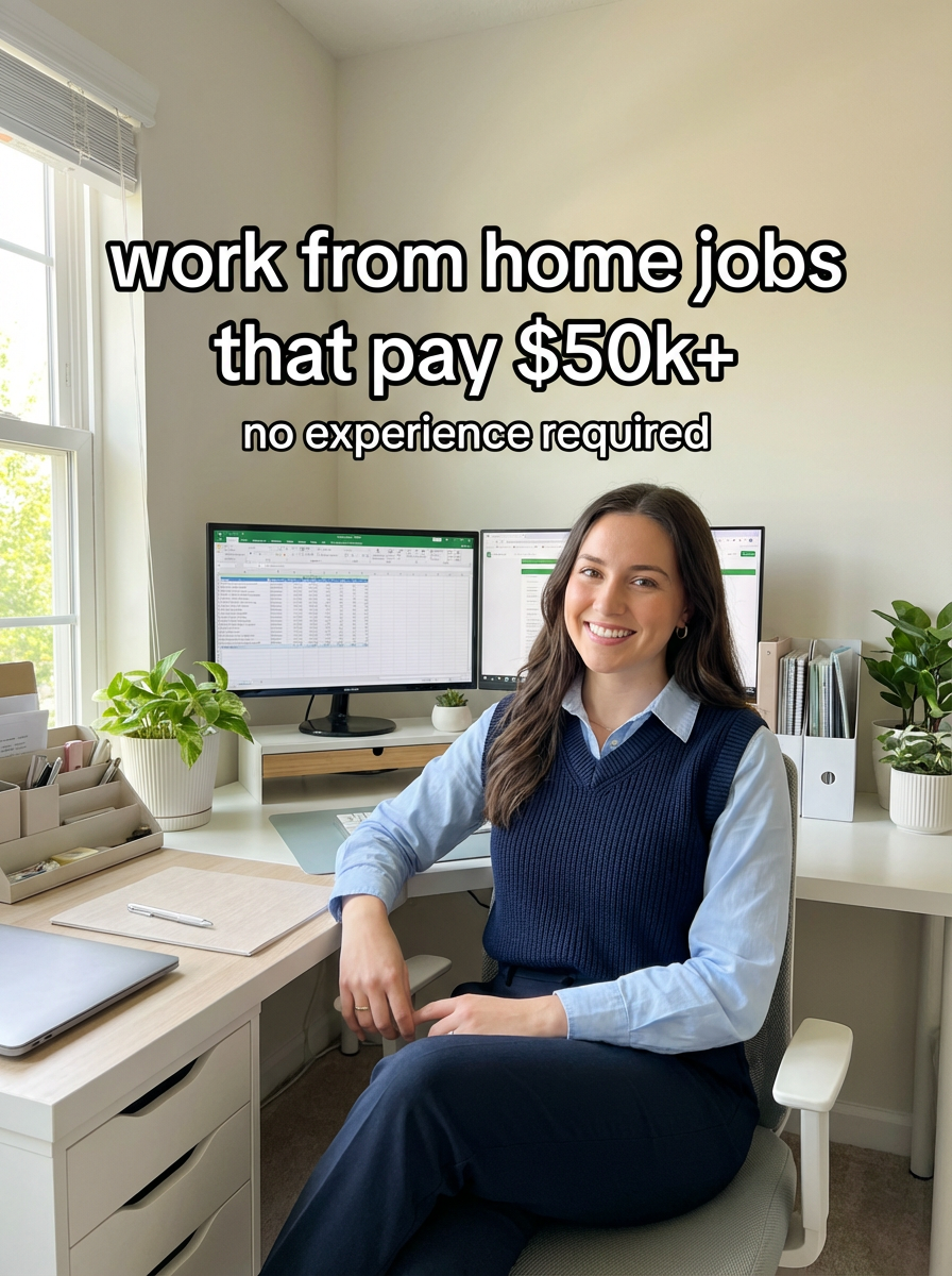 model in business casual outfit at home office setup, multiple monitors, plants, organized desk, natural lighting. TikTok TikTok-style text overlay with white text with black outline: "work from home jobs that pay $50k+" smaller text: "(no experience required)" , do not show tiktok interface or logo