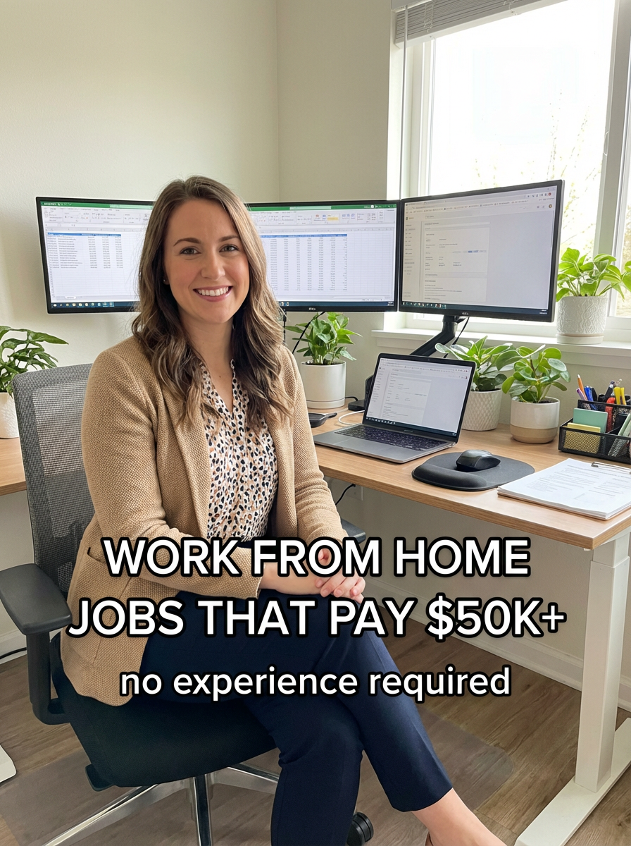 model in business casual outfit at home office setup, multiple monitors, plants, organized desk, natural lighting. TikTok TikTok-style text overlay with white text with black outline: "work from home jobs that pay $50k+" smaller text: "(no experience required)" , do not show tiktok interface or logo