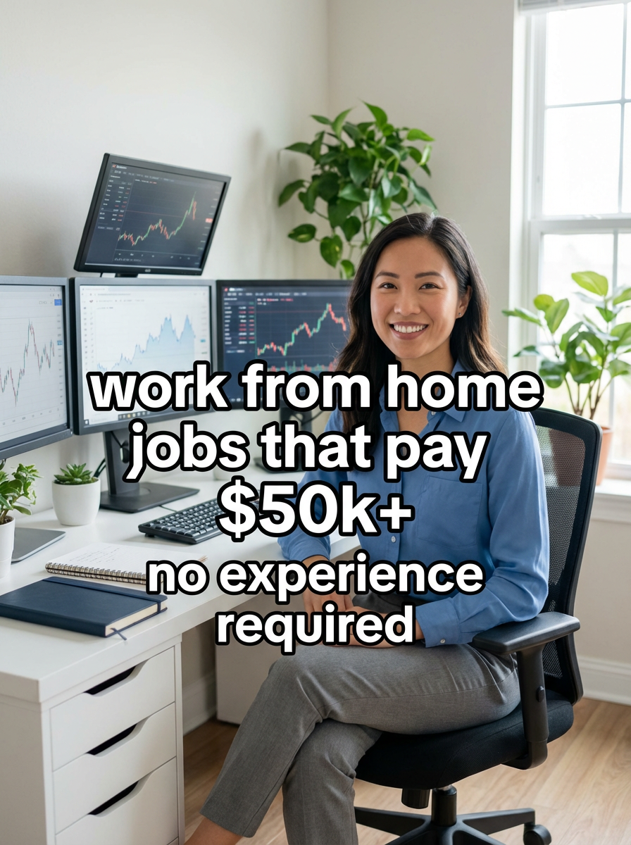 model in business casual outfit at home office setup, multiple monitors, plants, organized desk, natural lighting. TikTok-style text overlay with white text with black outline: "work from home jobs that pay $50k+" smaller text: "(no experience required)" , do not show tiktok interface or logo