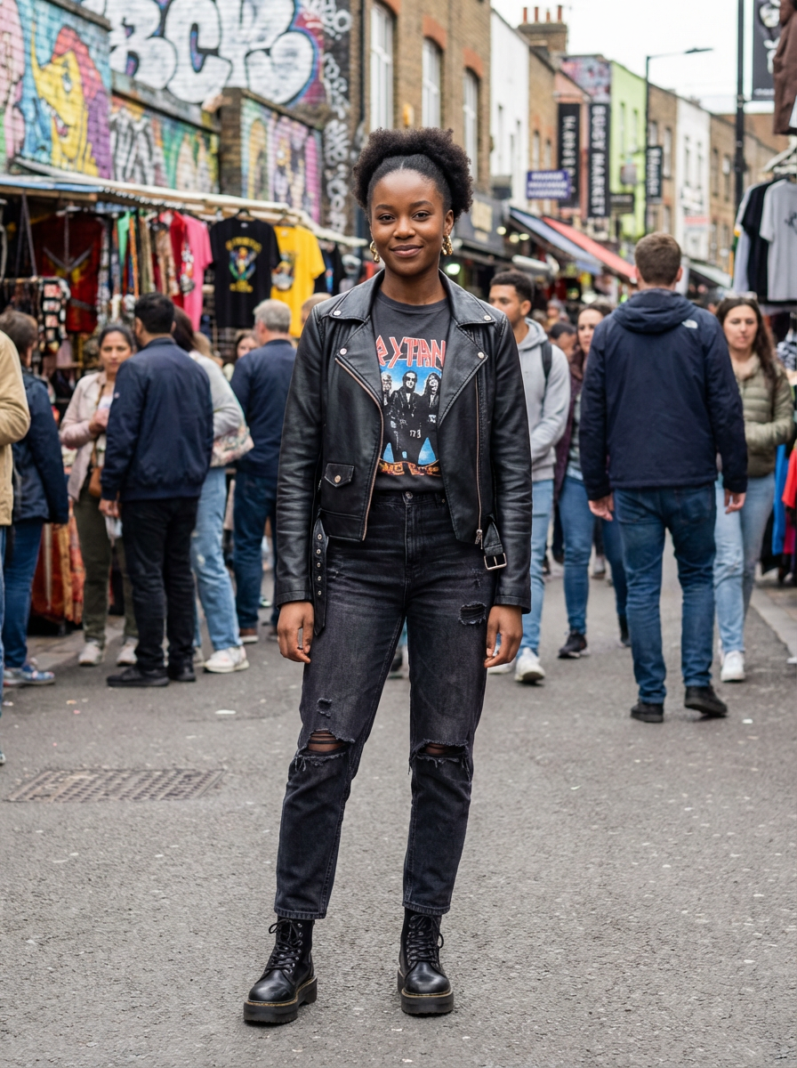 model in Camden Market, eclectic colorful background, edgy London style, alternative vibe