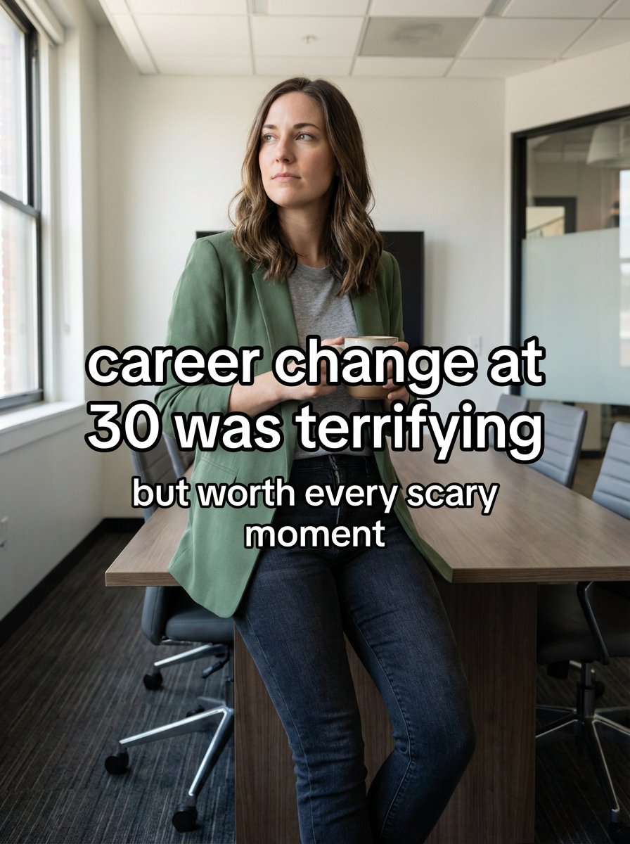 model in career change outfit in office or meeting room, confident but contemplative, transitional lighting. TikTok TikTok-style text overlay with white text with black outline: "career change at 30 was terrifying" smaller text: "(but worth every scary moment)" , do not show tiktok interface or logo