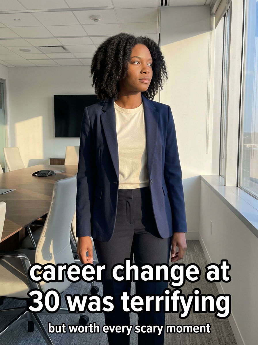 model in career change outfit in office or meeting room, confident but contemplative, transitional lighting. TikTok TikTok-style text overlay with white text with black outline: "career change at 30 was terrifying" smaller text: "(but worth every scary moment)" , do not show tiktok interface or logo