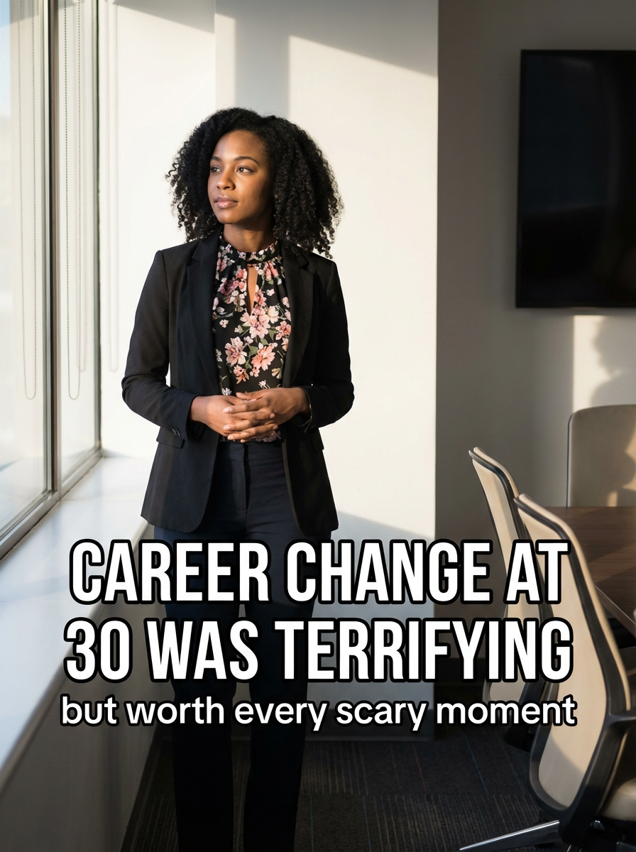 model in career change outfit in office or meeting room, confident but contemplative, transitional lighting. TikTok-style text overlay with white text with black outline: "career change at 30 was terrifying" smaller text: "(but worth every scary moment)" , do not show tiktok interface or logo