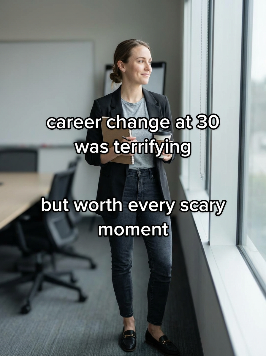 model in career change outfit in office or meeting room, confident but contemplative, transitional lighting. TikTok-style text overlay with white text with black outline: "career change at 30 was terrifying" smaller text: "(but worth every scary moment)" , do not show tiktok interface or logo
