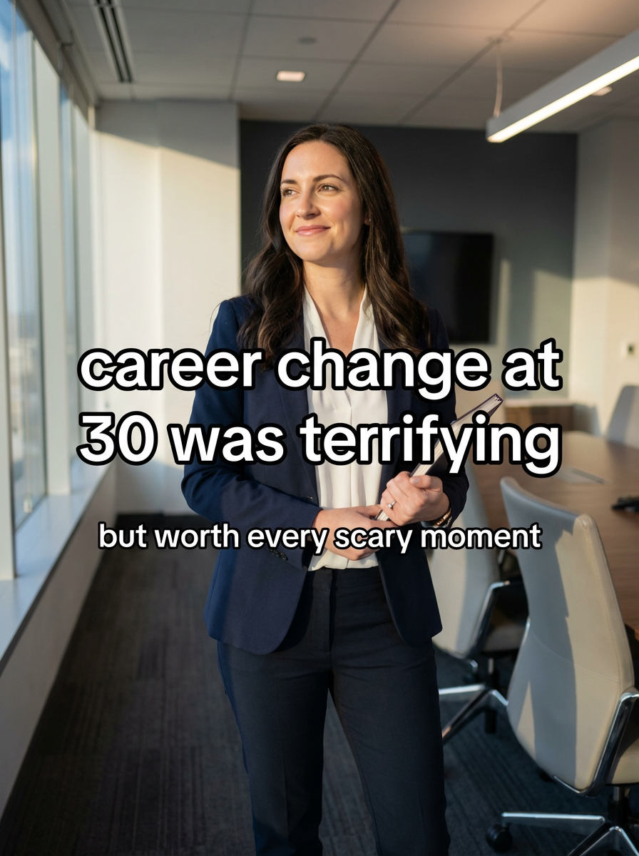 model in career change outfit in office or meeting room, confident but contemplative, transitional lighting. TikTok-style text overlay with white text with black outline: "career change at 30 was terrifying" smaller text: "(but worth every scary moment)" , do not show tiktok interface or logo