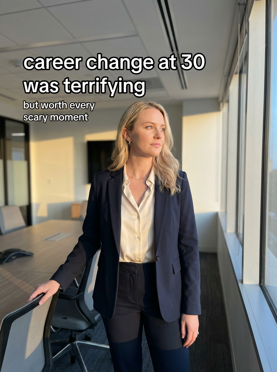 model in career change outfit in office or meeting room, confident but contemplative, transitional lighting. TikTok-style text overlay with white text with black outline: "career change at 30 was terrifying" smaller text: "(but worth every scary moment)" , do not show tiktok interface or logo