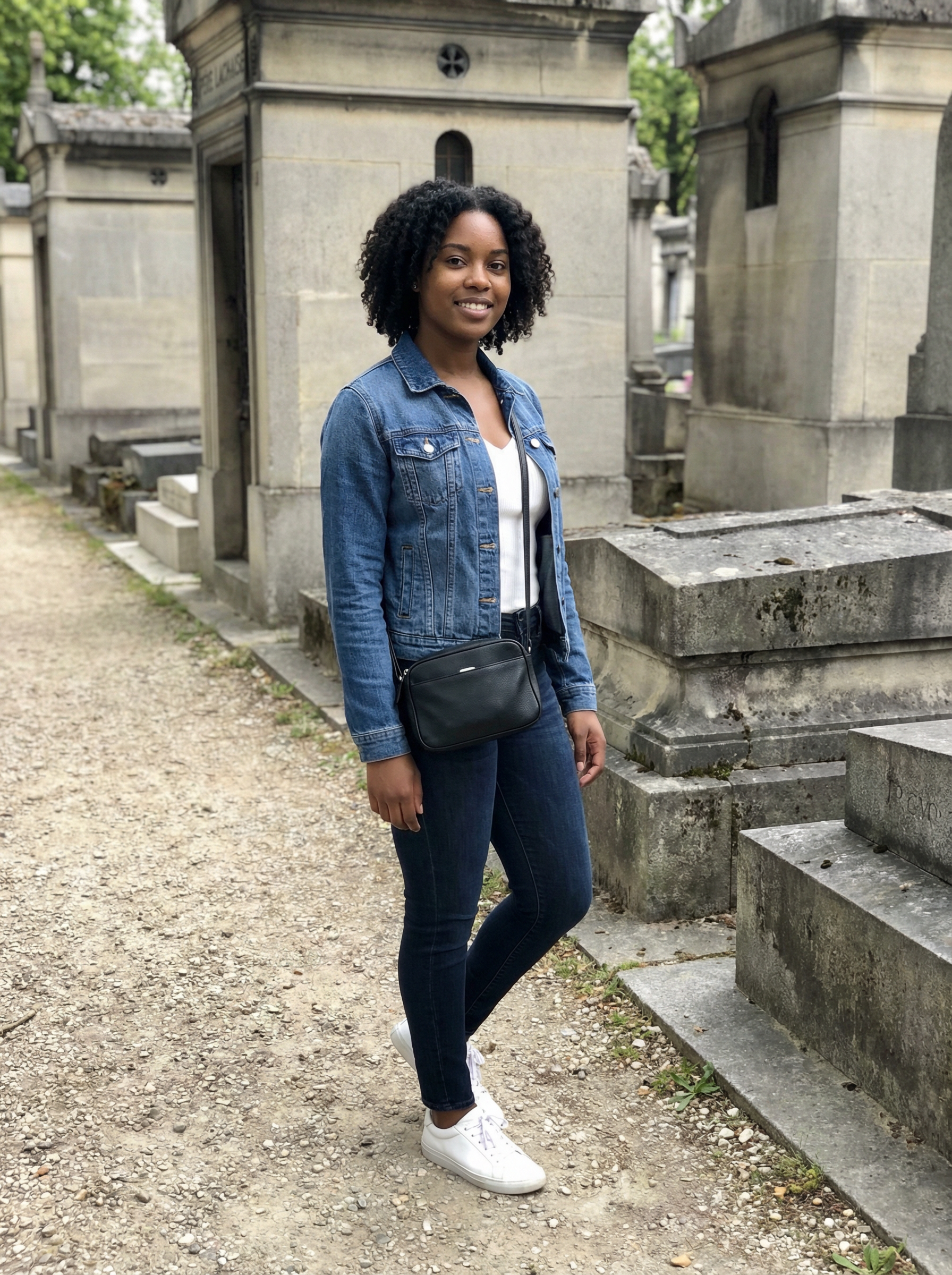 model in casual chic outfit, denim jacket, white sneakers, crossbody bag at Père Lachaise Cemetery, historic graves and monuments, peaceful cemetery paths, cultural pilgrimage site, respectful tourist moment, historical significance