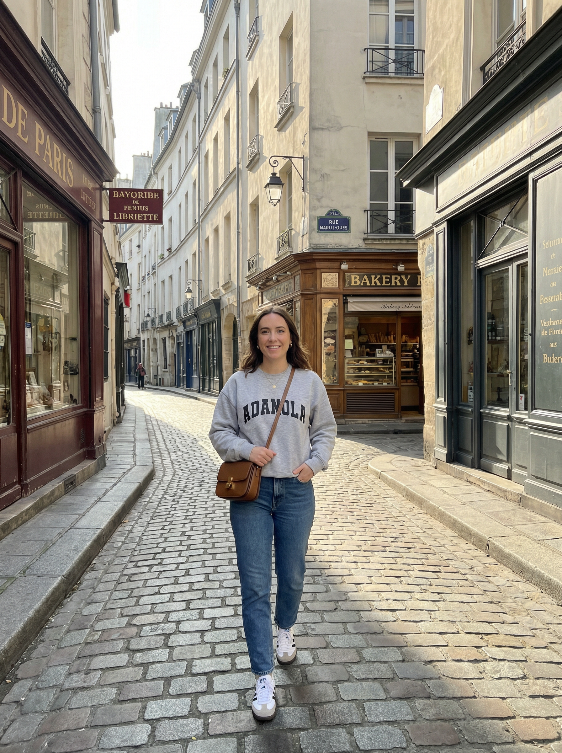 model in casual sweater, jeans, comfortable sneakers, crossbody bag exploring Marais district narrow streets, historic Jewish quarter, charming old buildings, afternoon shadows, authentic neighborhood exploration, local culture immersion