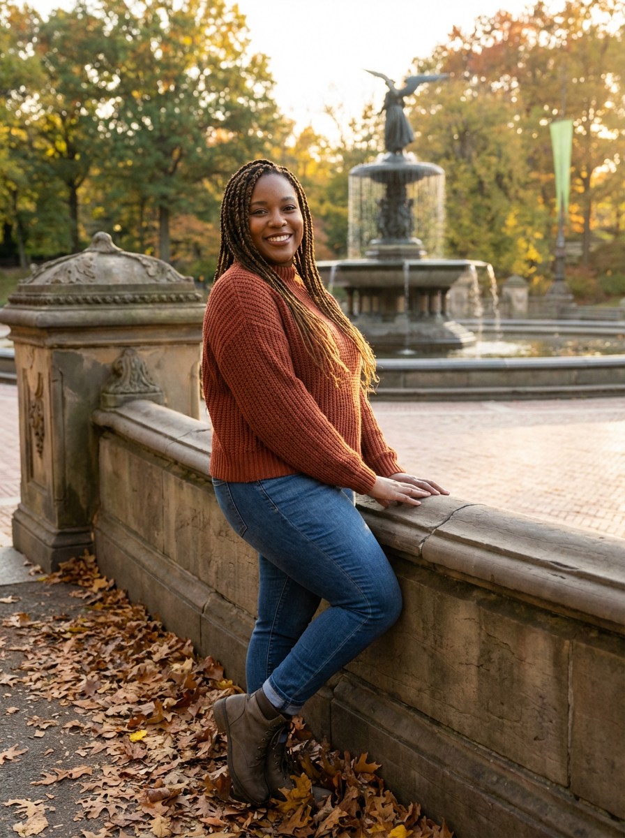 model in Central Park, autumn leaves, Bethesda Fountain background, cozy fall outfit, warm natural lighting