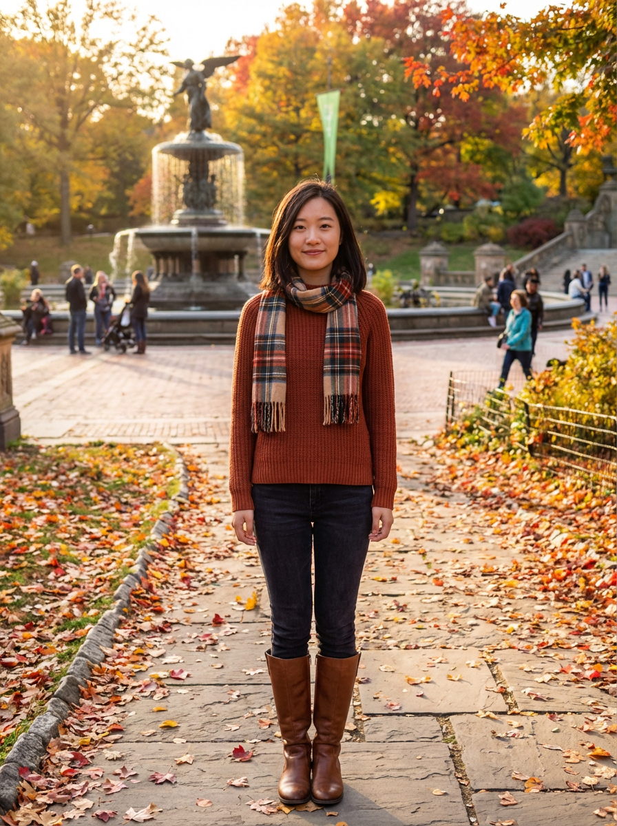 model in Central Park, autumn leaves, Bethesda Fountain background, cozy fall outfit, warm natural lighting