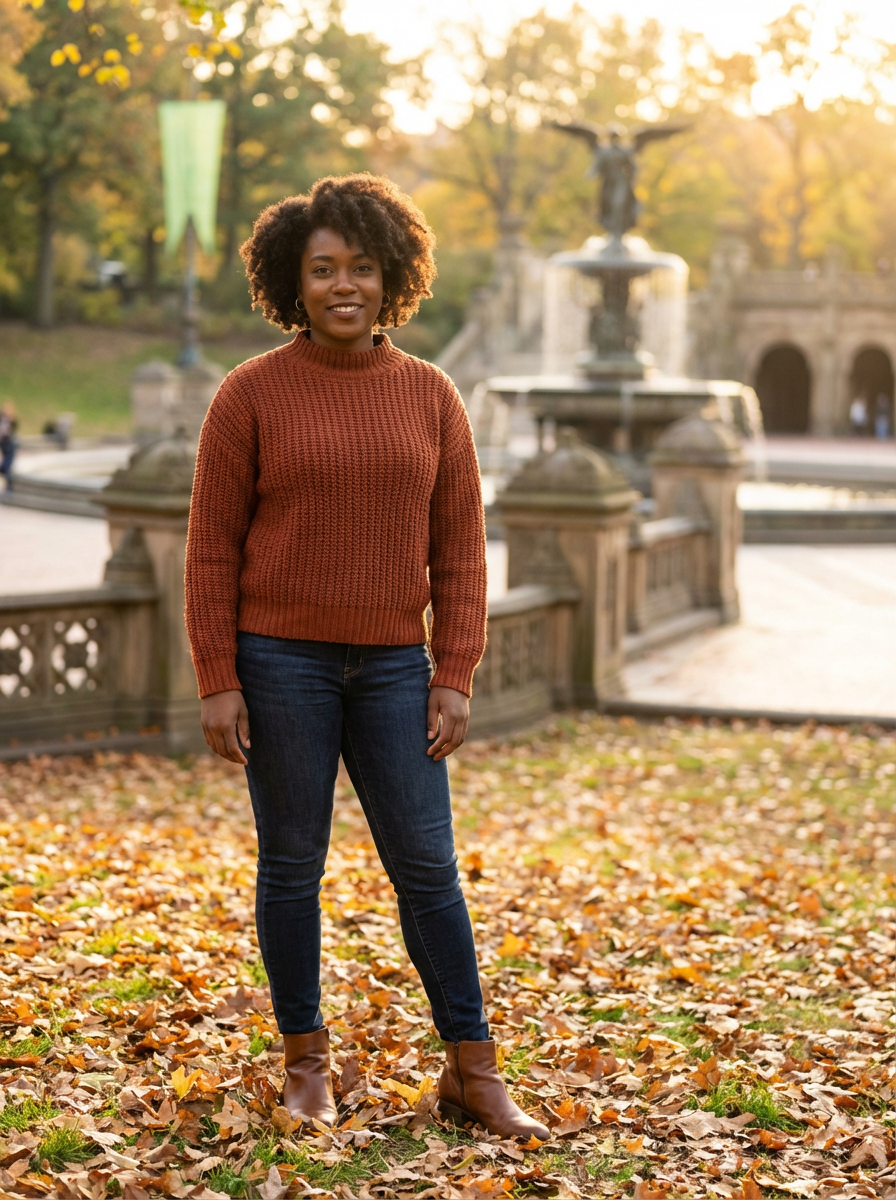 model in Central Park, autumn leaves, Bethesda Fountain background, cozy fall outfit, warm natural lighting
