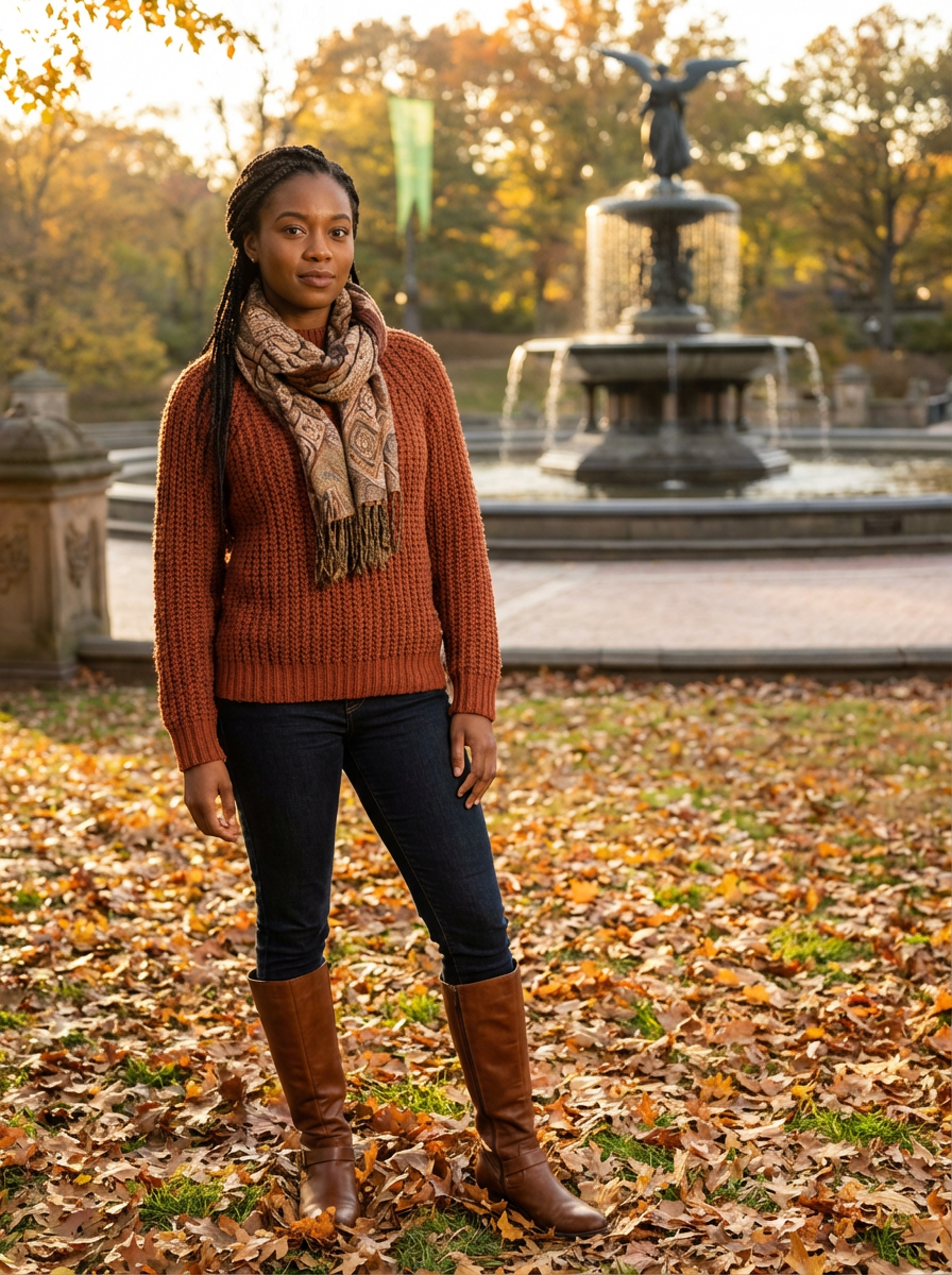 model in Central Park, autumn leaves, Bethesda Fountain background, cozy fall outfit, warm natural lighting