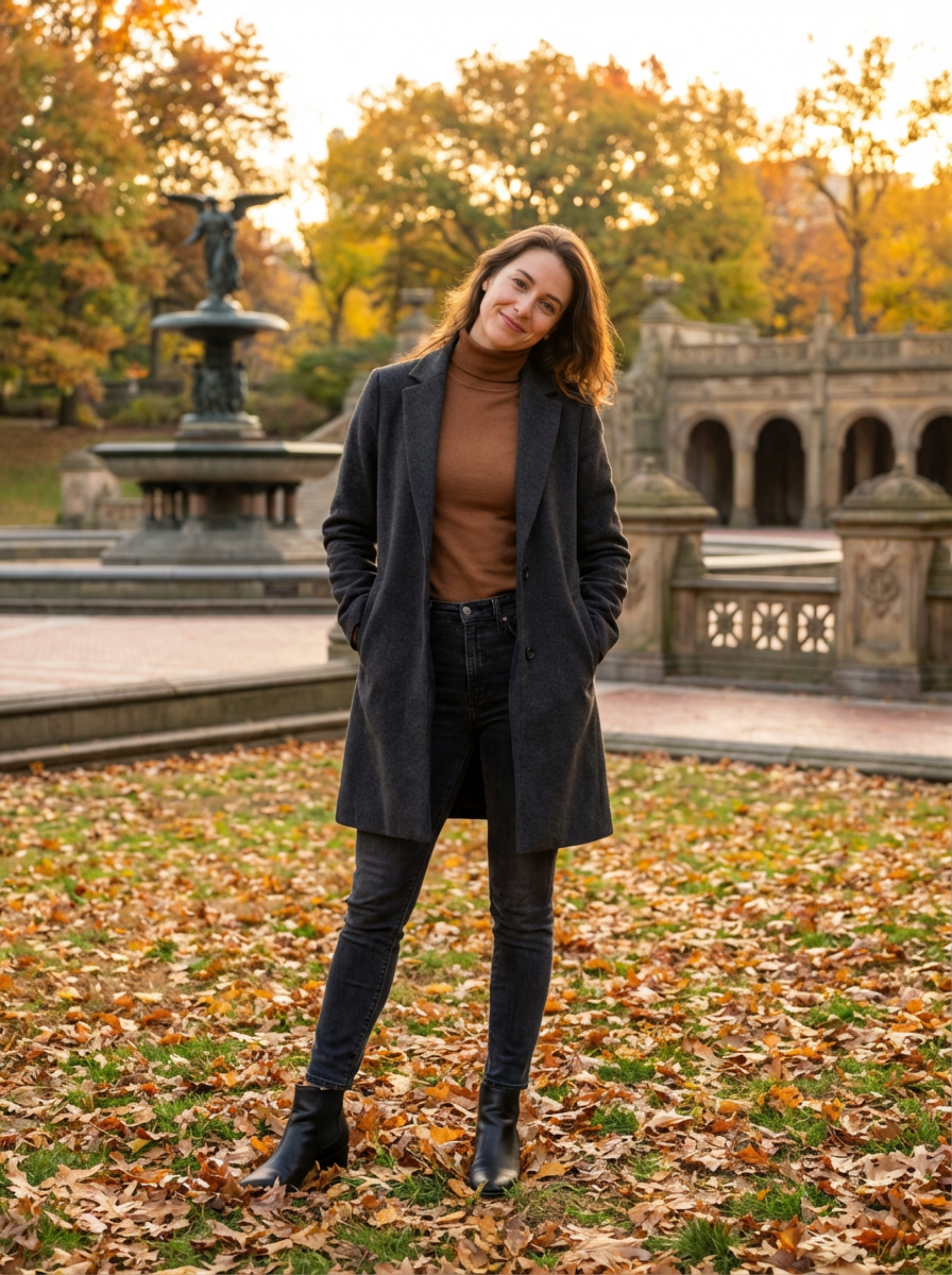 model in Central Park, autumn leaves, Bethesda Fountain background, cozy fall outfit, warm natural lighting