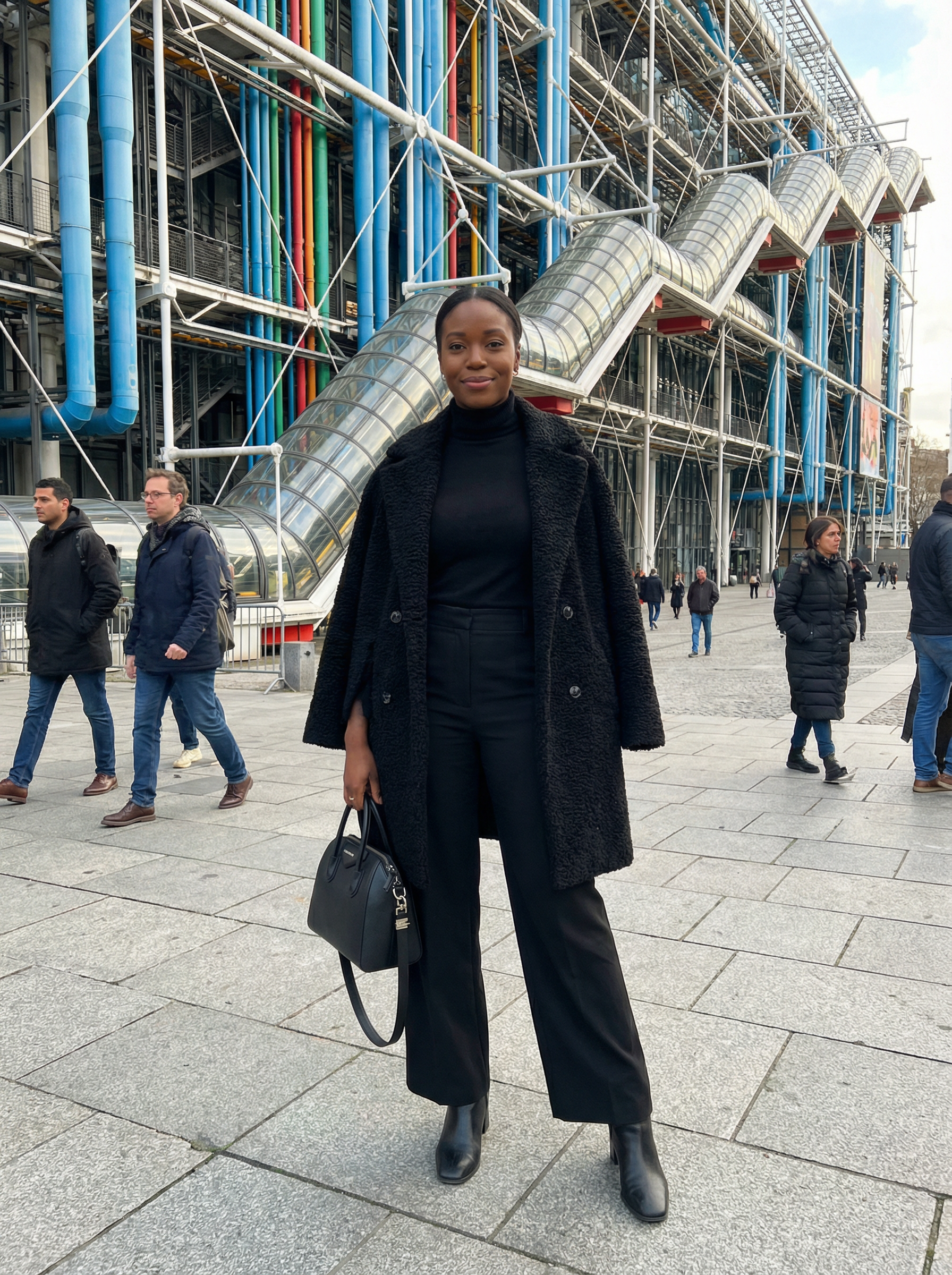 model in chic all-black outfit, statement coat, ankle boots, designer bag at modern art museum Centre Pompidou, contemporary architecture, colorful building exterior, artistic cultural scene, urban sophistication, modern Paris aesthetic