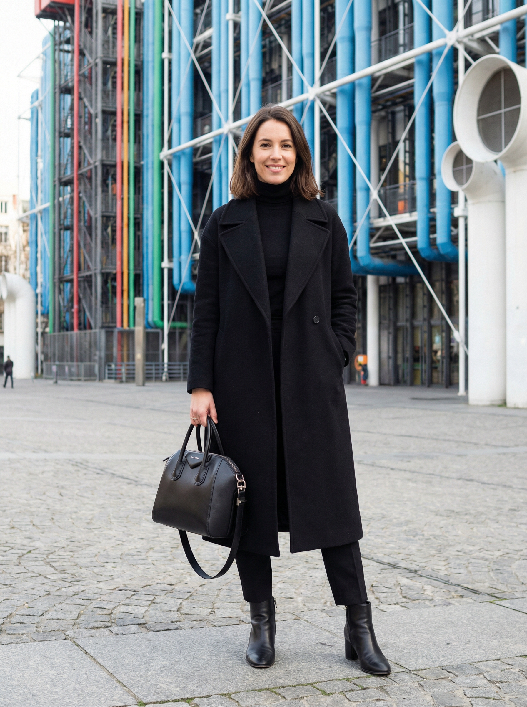 model in chic all-black outfit, statement coat, ankle boots, designer bag at modern art museum Centre Pompidou, contemporary architecture, colorful building exterior, artistic cultural scene, urban sophistication, modern Paris aesthetic