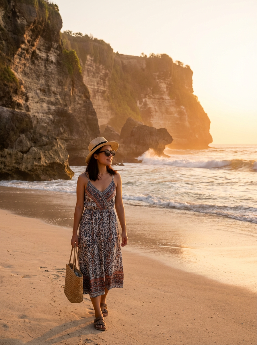 model in chic beachwear walking along pristine beach in Uluwatu at sunset, dramatic cliffs in background