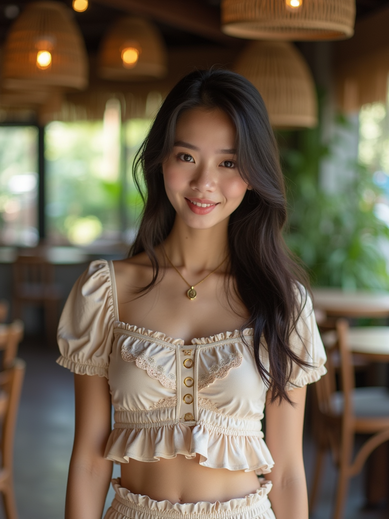 model in chic cafe outfit at trendy Canggu cafe with tropical minimalist decor