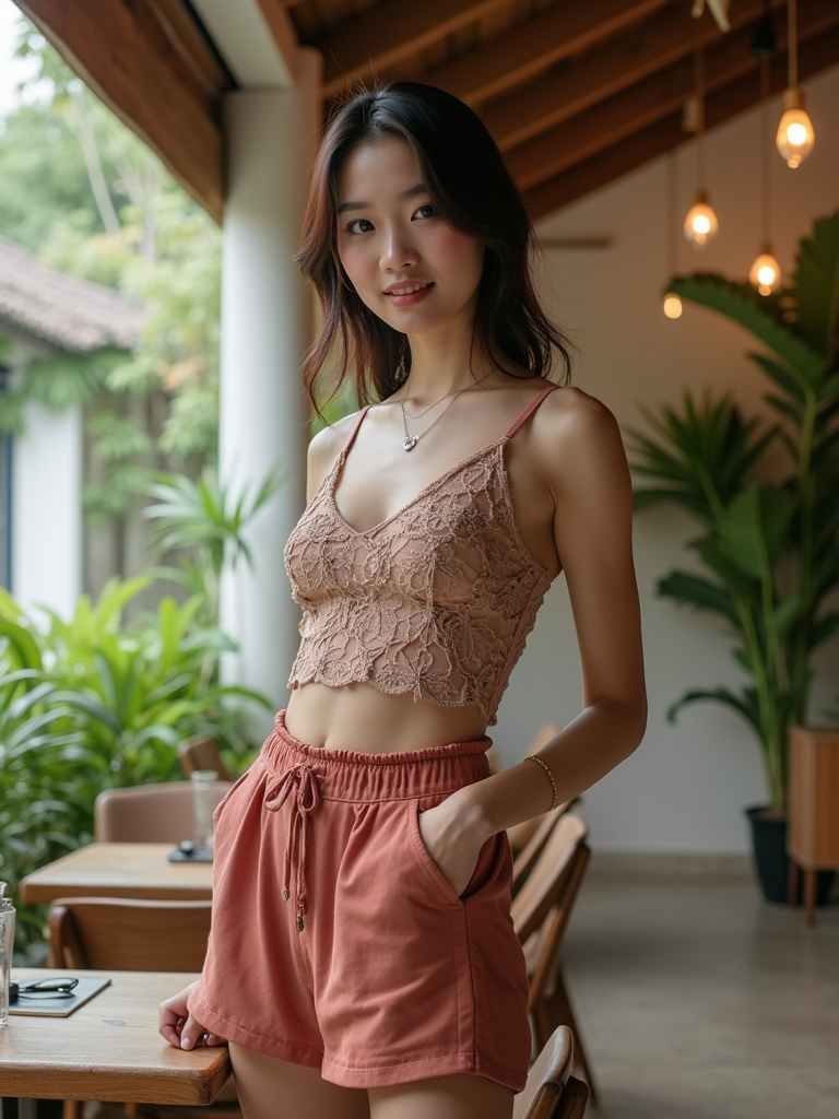 model in chic cafe outfit at trendy Canggu cafe with tropical minimalist decor