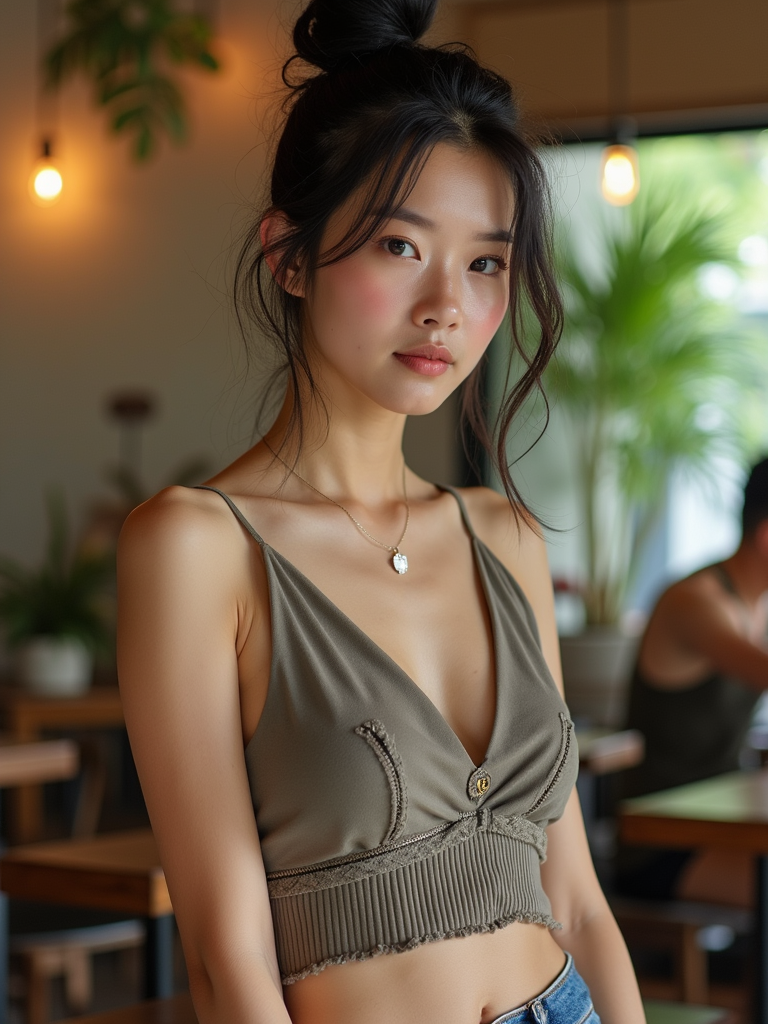 model in chic cafe outfit at trendy Canggu cafe with tropical minimalist decor