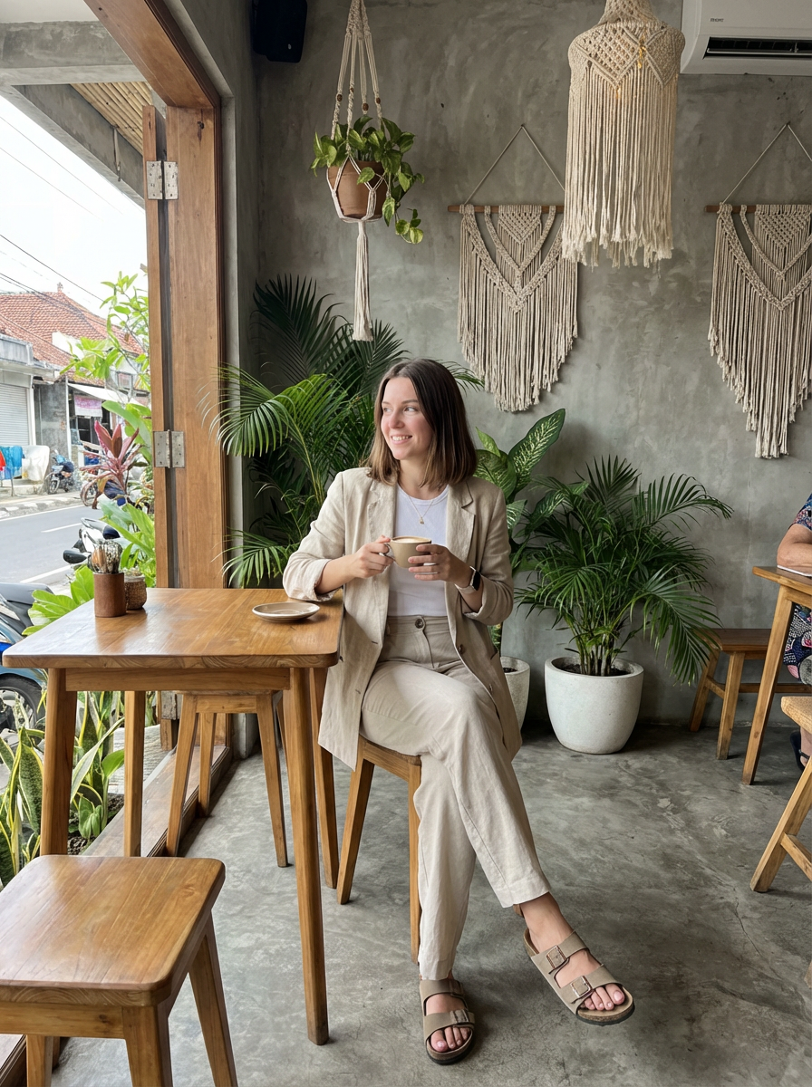 model in chic cafe outfit at trendy Canggu cafe with tropical minimalist decor
