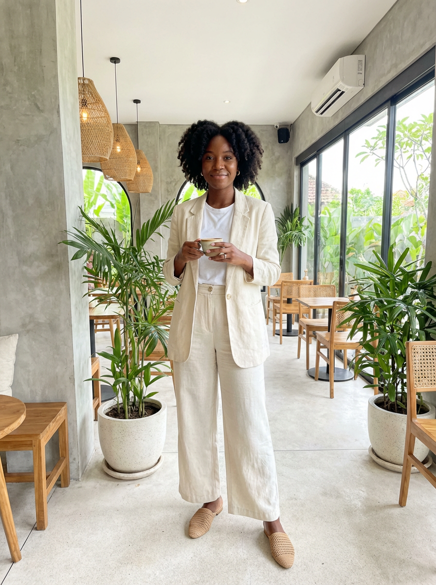 model in chic cafe outfit at trendy Canggu cafe with tropical minimalist decor