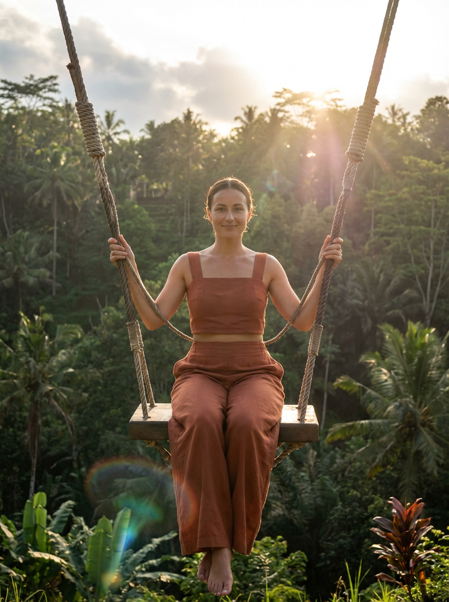 model in chic resort wear at jungle swing with vast valley view, dramatic lighting