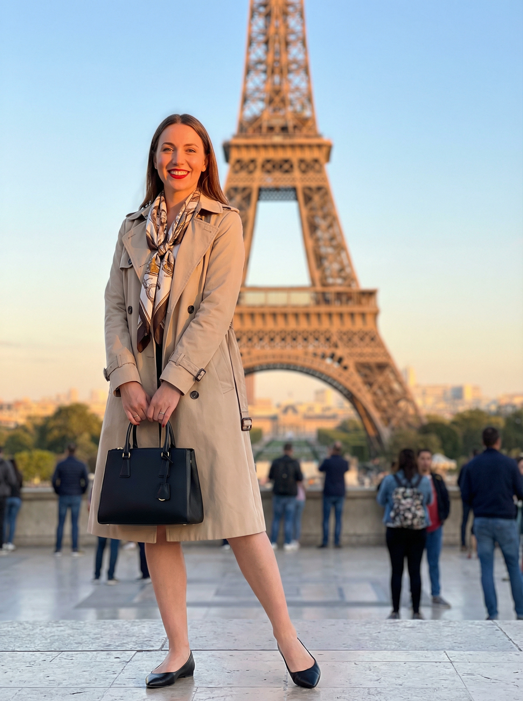 model in chic trench coat, silk scarf, pointed-toe flats, structured handbag, red lipstick standing in front of the Eiffel Tower at golden hour, romantic Parisian lighting, tourists in soft focus background, classic travel pose with tower perfectly framed, cinematic depth of field, dreamy sunset glow