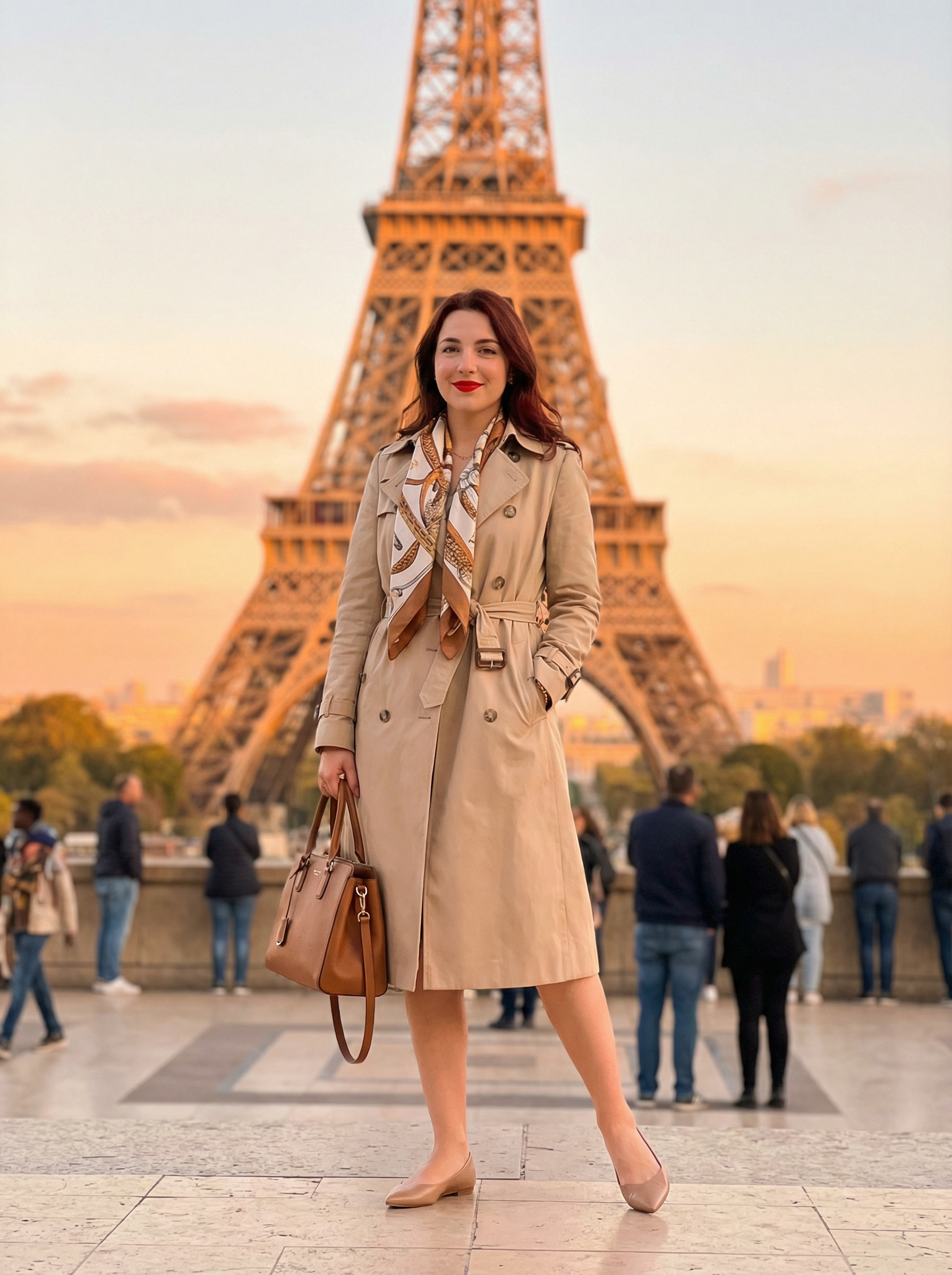 model in chic trench coat, silk scarf, pointed-toe flats, structured handbag, red lipstick standing in front of the Eiffel Tower at golden hour, romantic Parisian lighting, tourists in soft focus background, classic travel pose with tower perfectly framed, cinematic depth of field, dreamy sunset glow