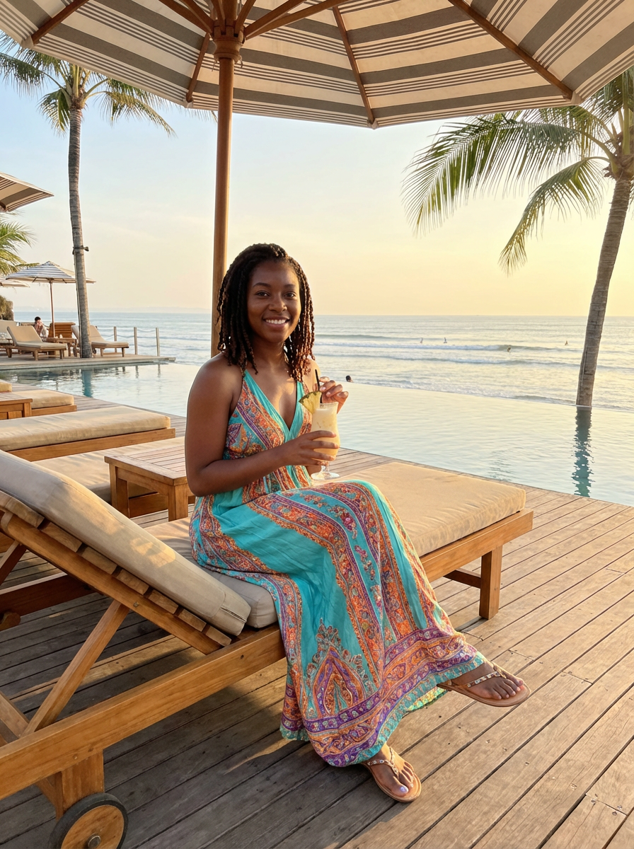 model in colorful resort wear sitting at luxury beach club in Canggu with ocean view, holding tropical cocktail