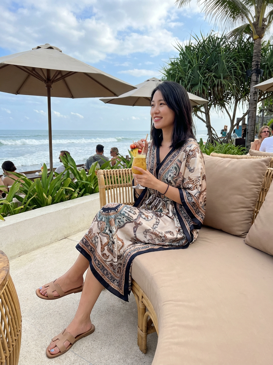 model in colorful resort wear sitting at luxury beach club in Canggu with ocean view, holding tropical cocktail