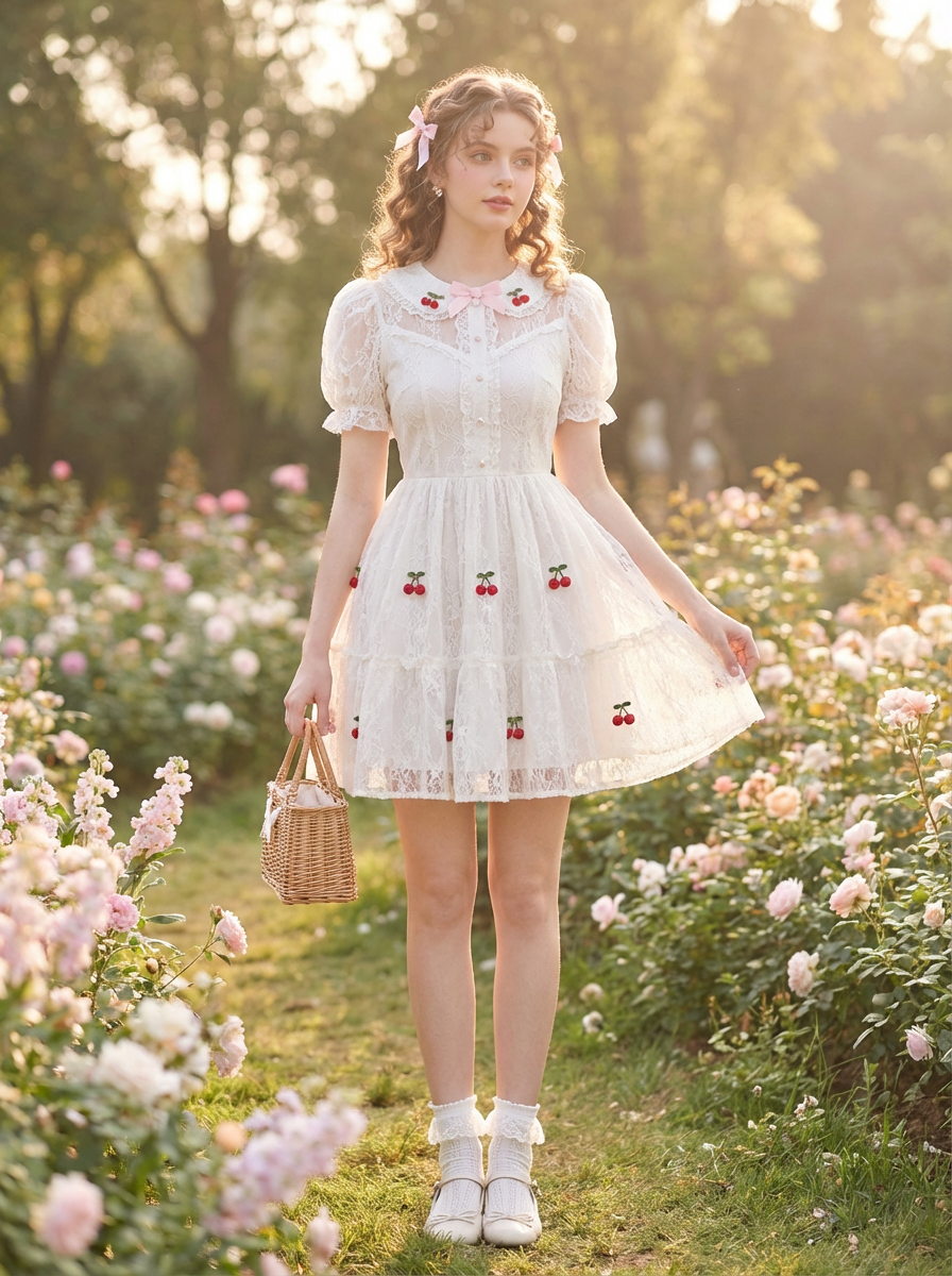 model in coquette fashion, white lace dress, dainty bow accessories, cherry motifs, soft dreamy lighting