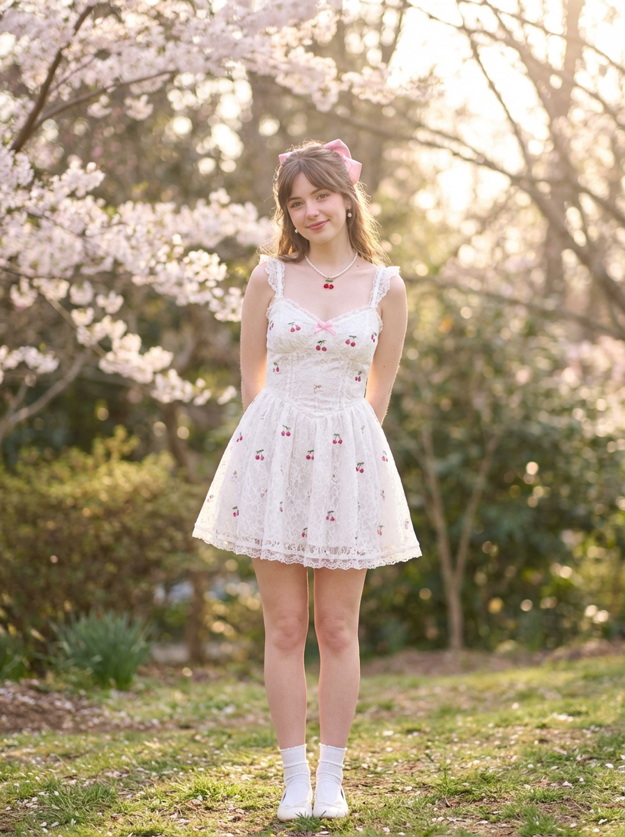 model in coquette fashion, white lace dress, dainty bow accessories, cherry motifs, soft dreamy lighting